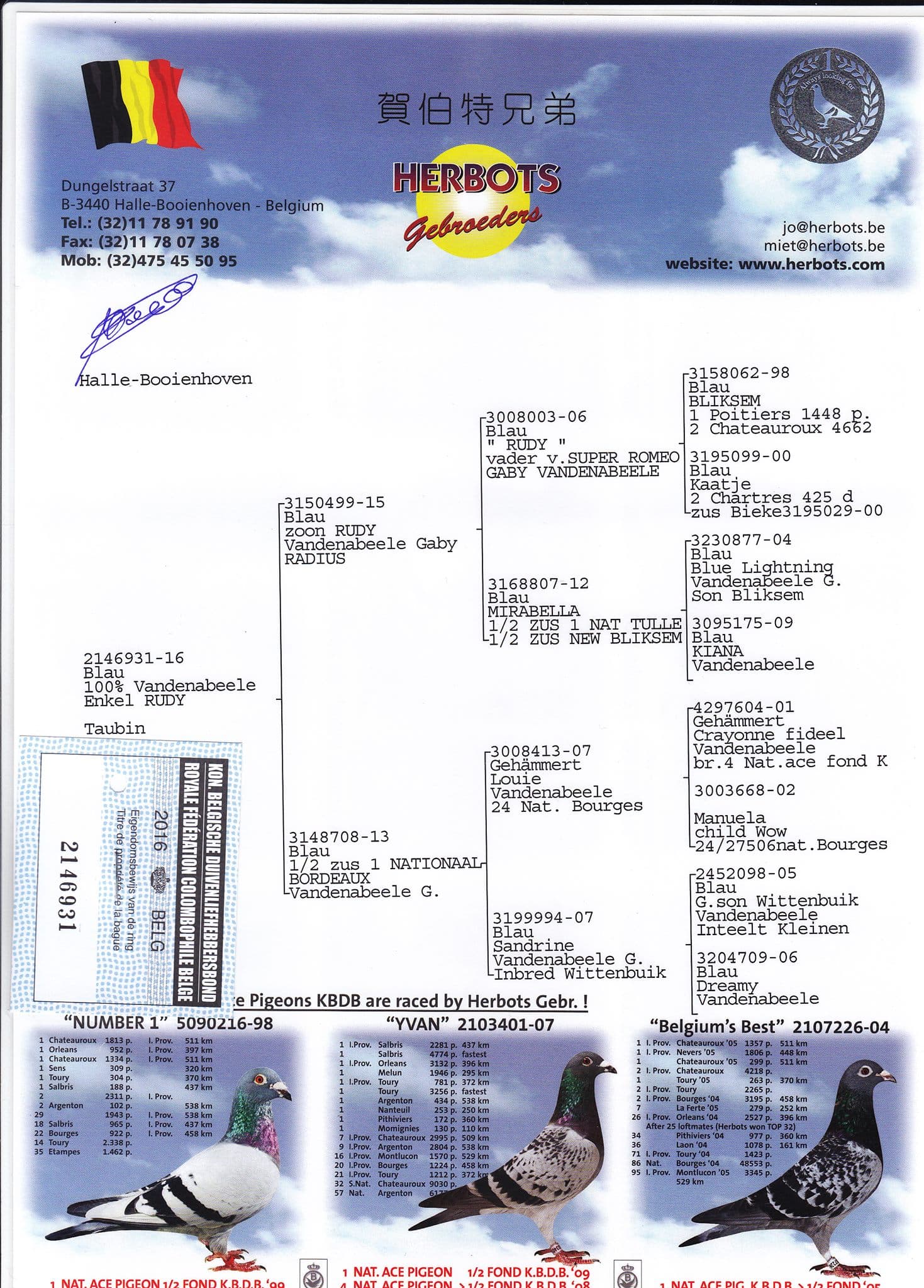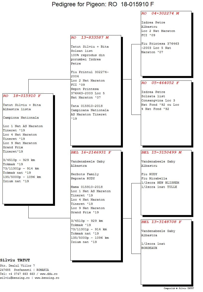 The hen with serial number 015910-2018 who is 50% Herbots from 2146931-2016 won the title of 1st National Ace bird Marathong yearlings in Romania at the loft of Silviu Tatut. The mother is a 100% Vandenabeele pigeon and is a granddaughter from super breeder 'Rudy' and was bred at the Herbots breeding loft!