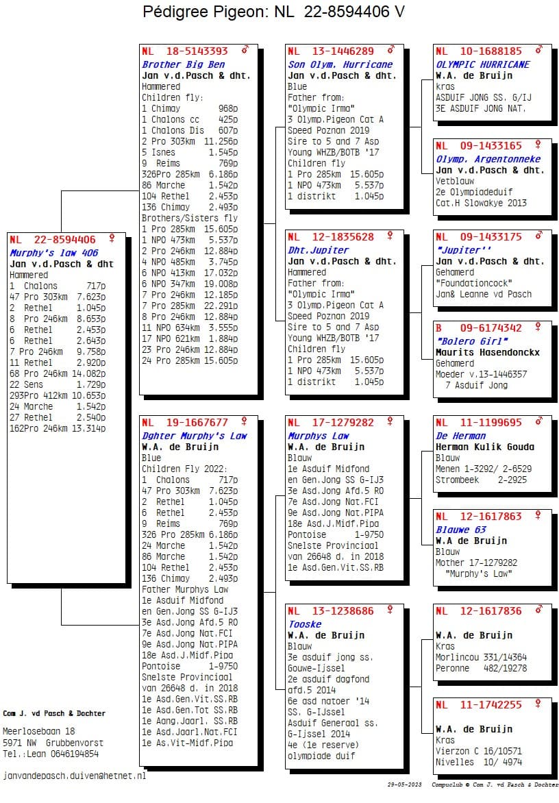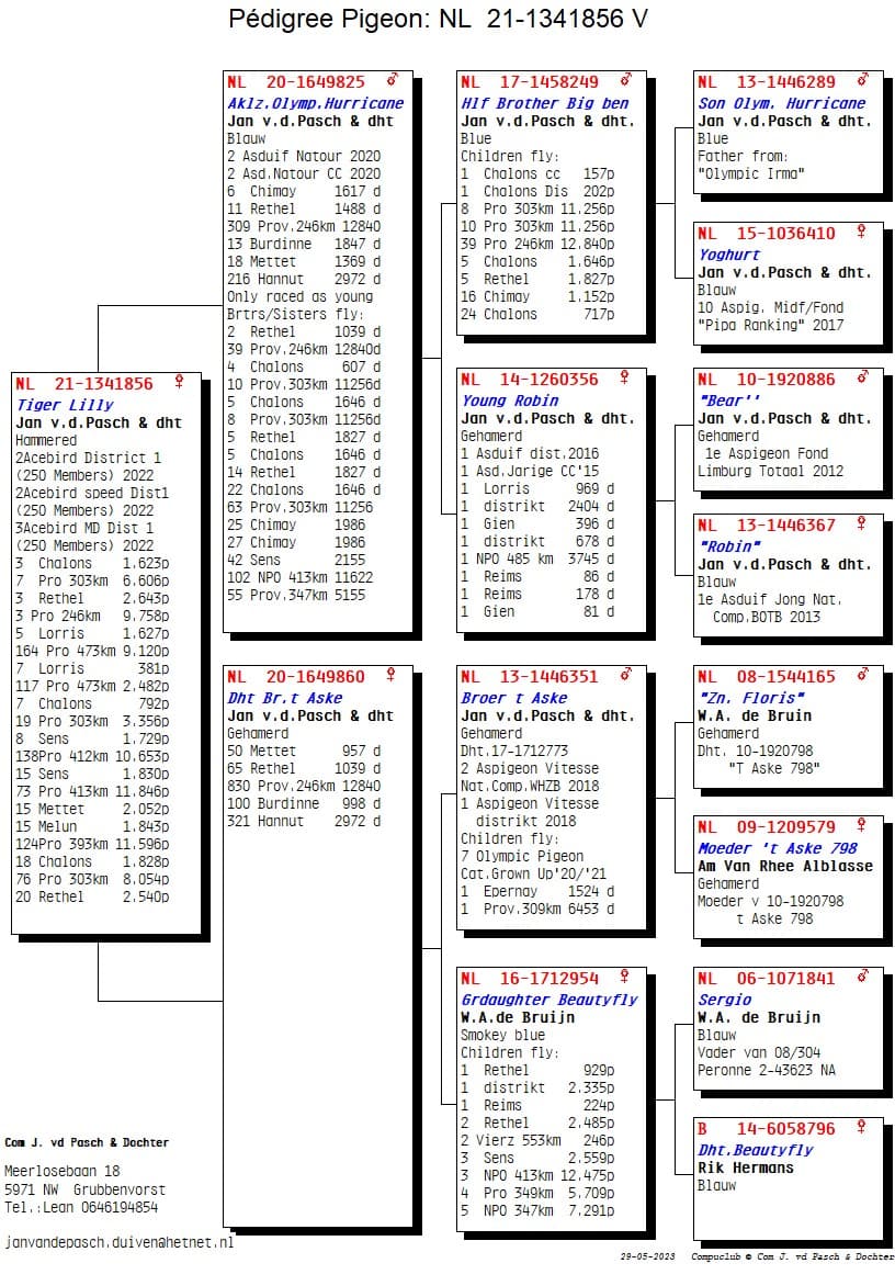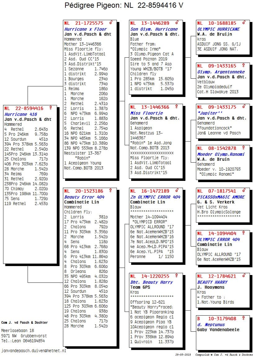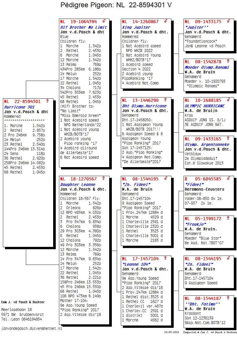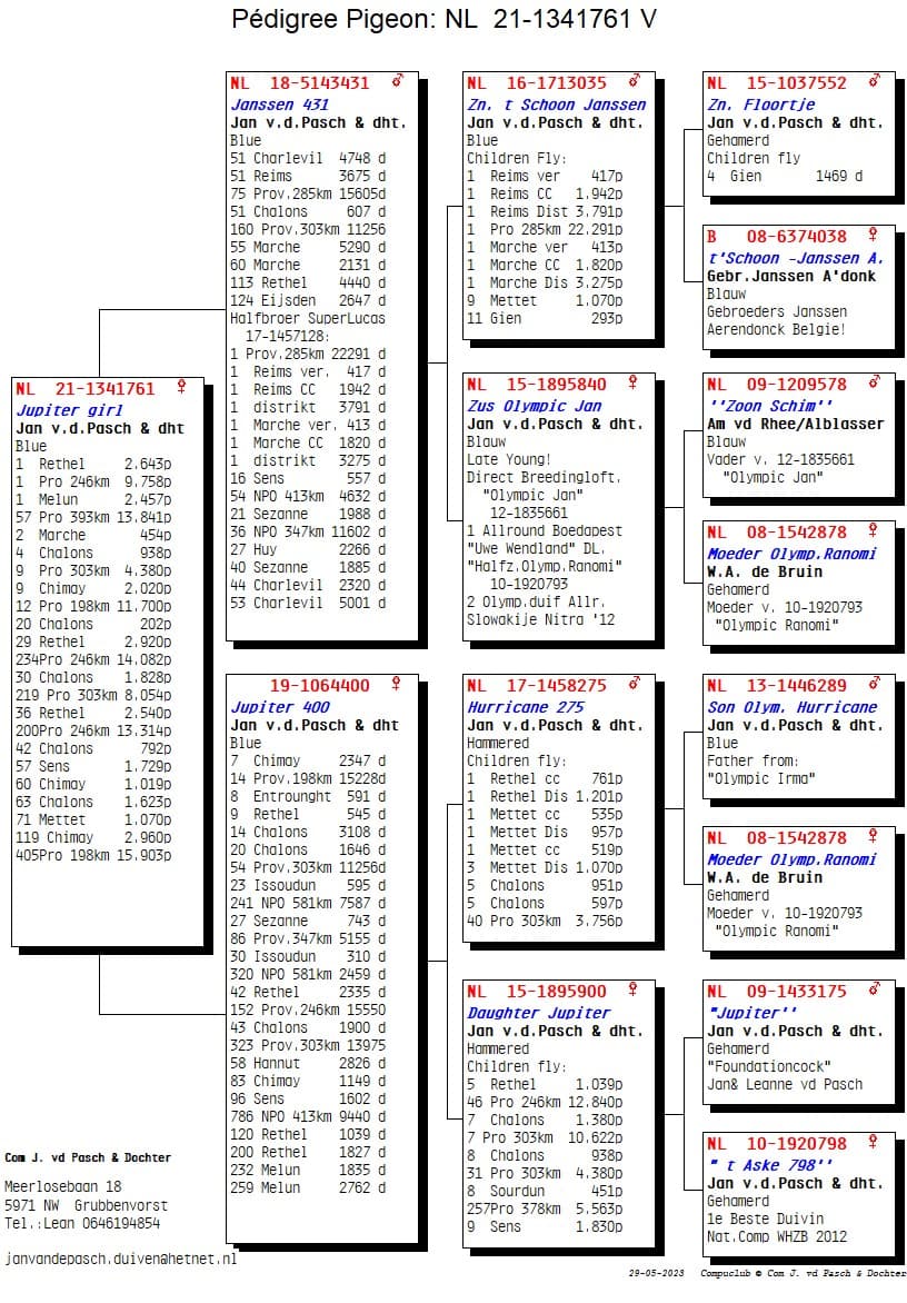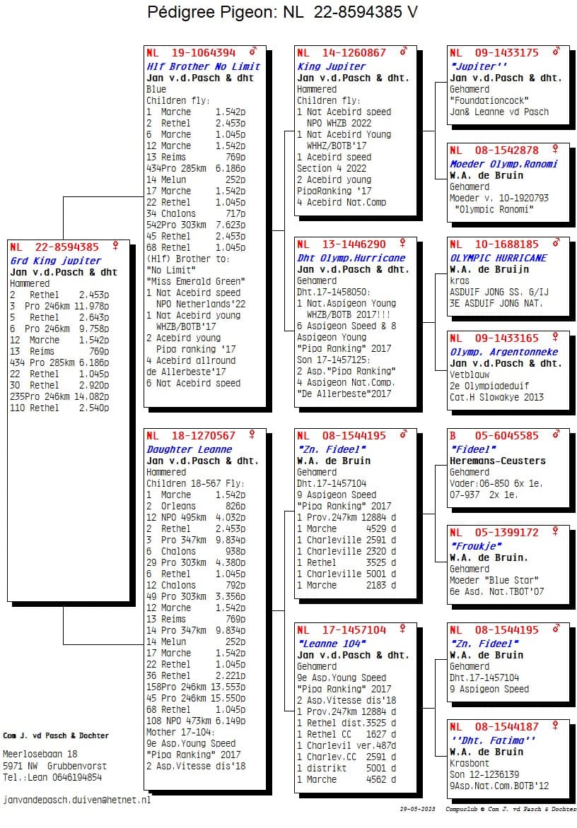 The start of the season was already great for Ricardo and Leanne as Team Van de Pacsh in Grubbenvorst in the Netherlands. During the weeks in May with a strong headwind, the pigeons continued their momentum, but on Rethel on 27 May they took it one step further. They won 1,2,3,5,6,7,10 Provincial against 9,758 pigeons at speeds of 1280 m/min in the Northern area of ​​Limburg. A result such as Jan was able to hit hard in the past and they are used to by the Van de Pasch family in the meantime, but it is still a kick when the pigeons come home so hard. The winner is no ordinary pigeon because “NL 21-1341761” Jupiter Girl now won the 1st Provincial Rethel against 9,758 pigeons, but also won a 1st Melun against 2,457 pigeons in the district a few weeks ago. A topper with a strong track record