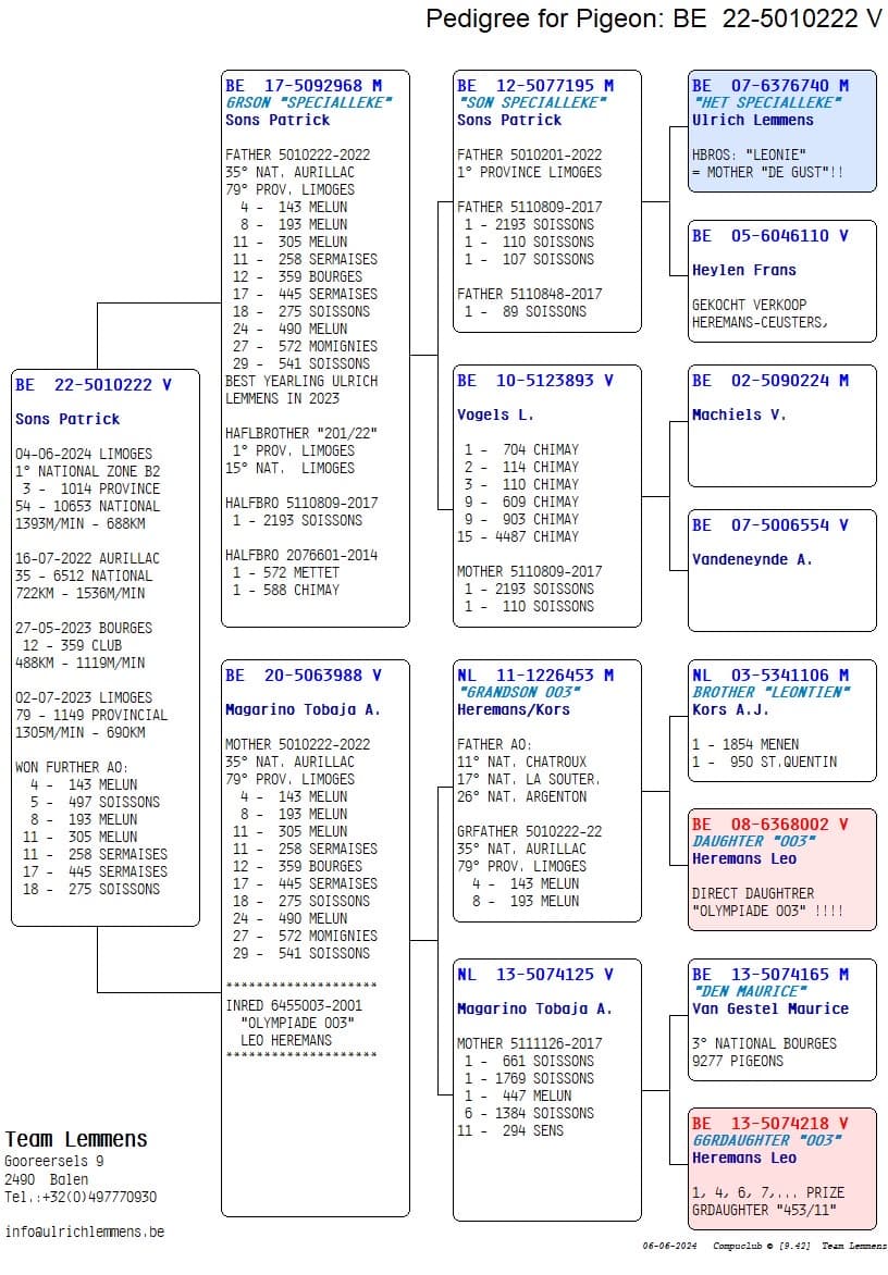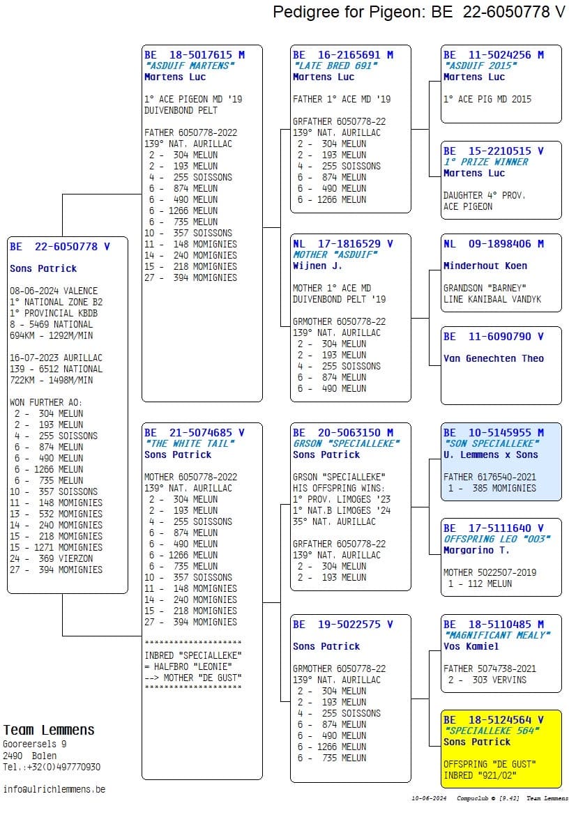 Son of “195/12” Son Specialleke Ulrich Lemmens x “893/10” L Vogels won 1-2-3-9 -9 on Chimay
