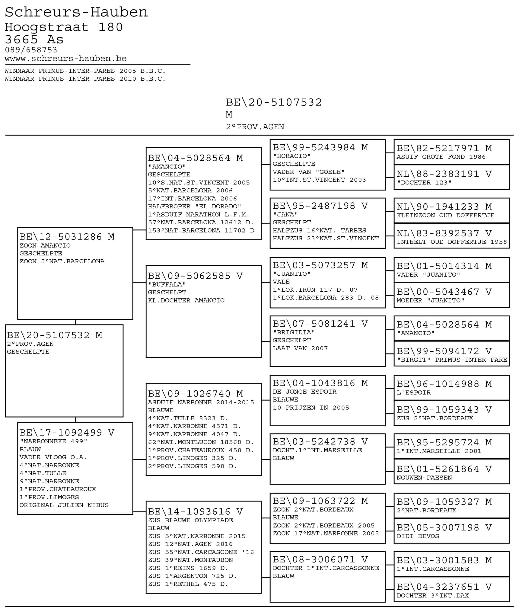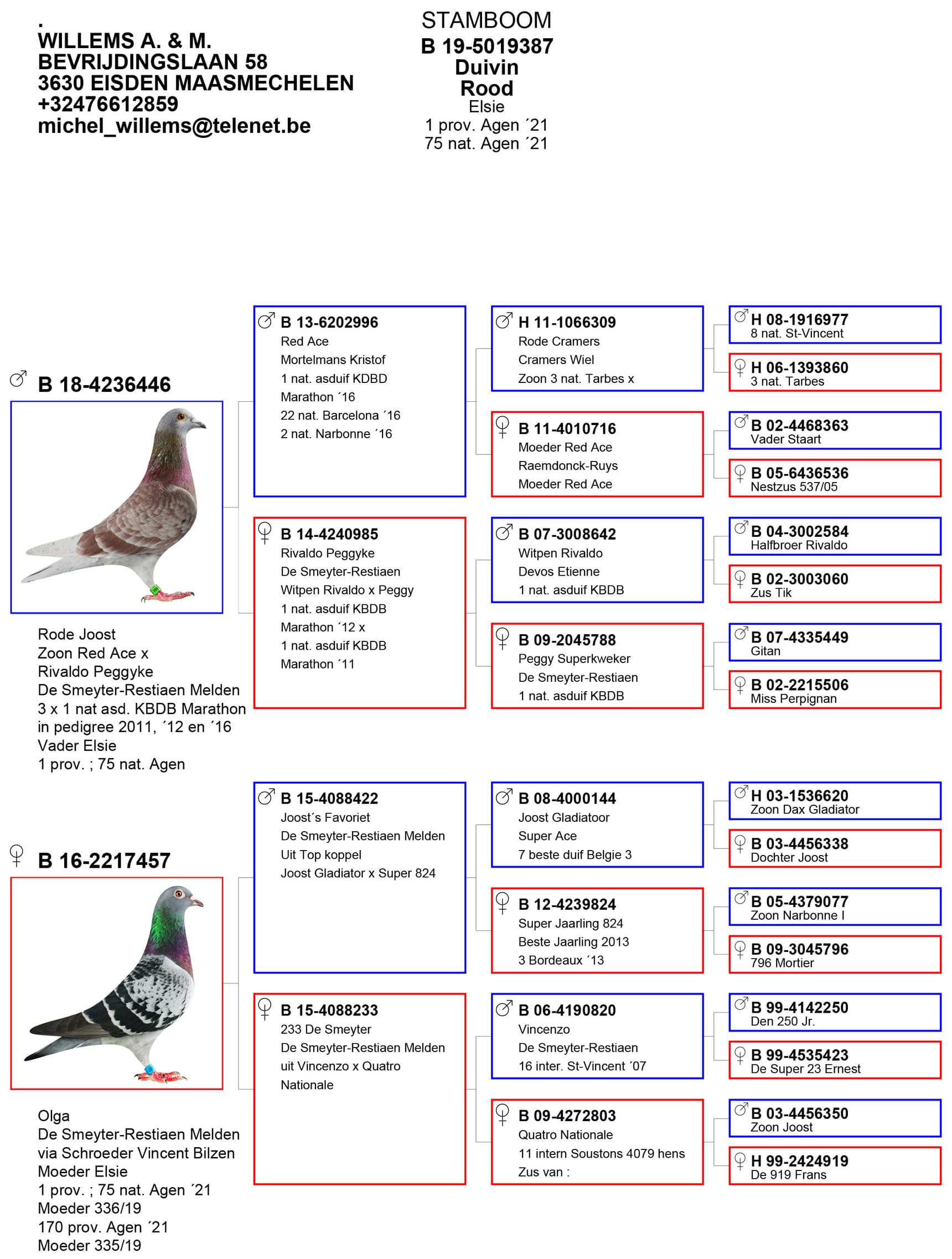 Son to “Red Ace” 1 Nat Ace bird ELD KBDB 2016 at Kristof Mortelmans x Daughter Peggy 1 Nat Ace bird ELD KBDB 2011