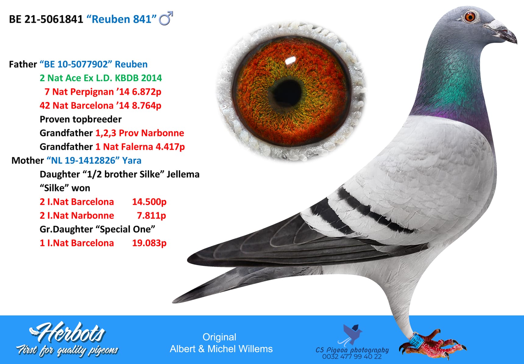 Is a direct son to “Reuben” 2 Nat Ace bird ELD KBDB 2014 with ao 7th National Perpignan and 42nd National Barcelona coupled to the strain of “Silke” from Jelle Jellema