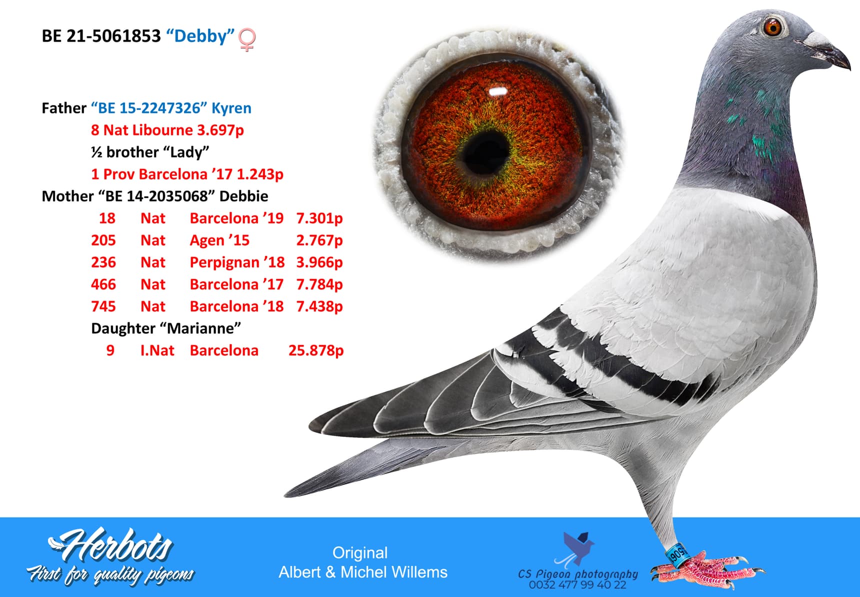 Is a daughter to “Kyren” 8th National Libourne and ½ brother 1st Provincial Barcelona coupled to their best Barcelona hen “Debbie” who won the 18th National Barcelona and is a daughter to “Marianna” who won the 9th International Barcelona.