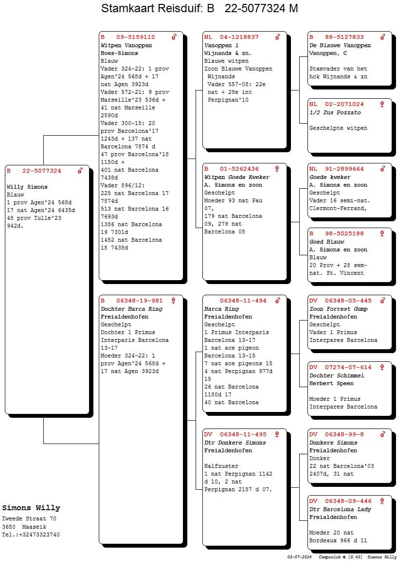 Willy Simons' approach is proving fruitful, both now and in the past. Willy already won several championship titles in the province of Limburg in 2018 with his Freialdenhofen descendants, and in 2020 he also achieved a 1st provincial Marseille against 426 pigeons. His pigeon BE22-5077324 has given an impressive performance with this victory, at provincial, national and international level.