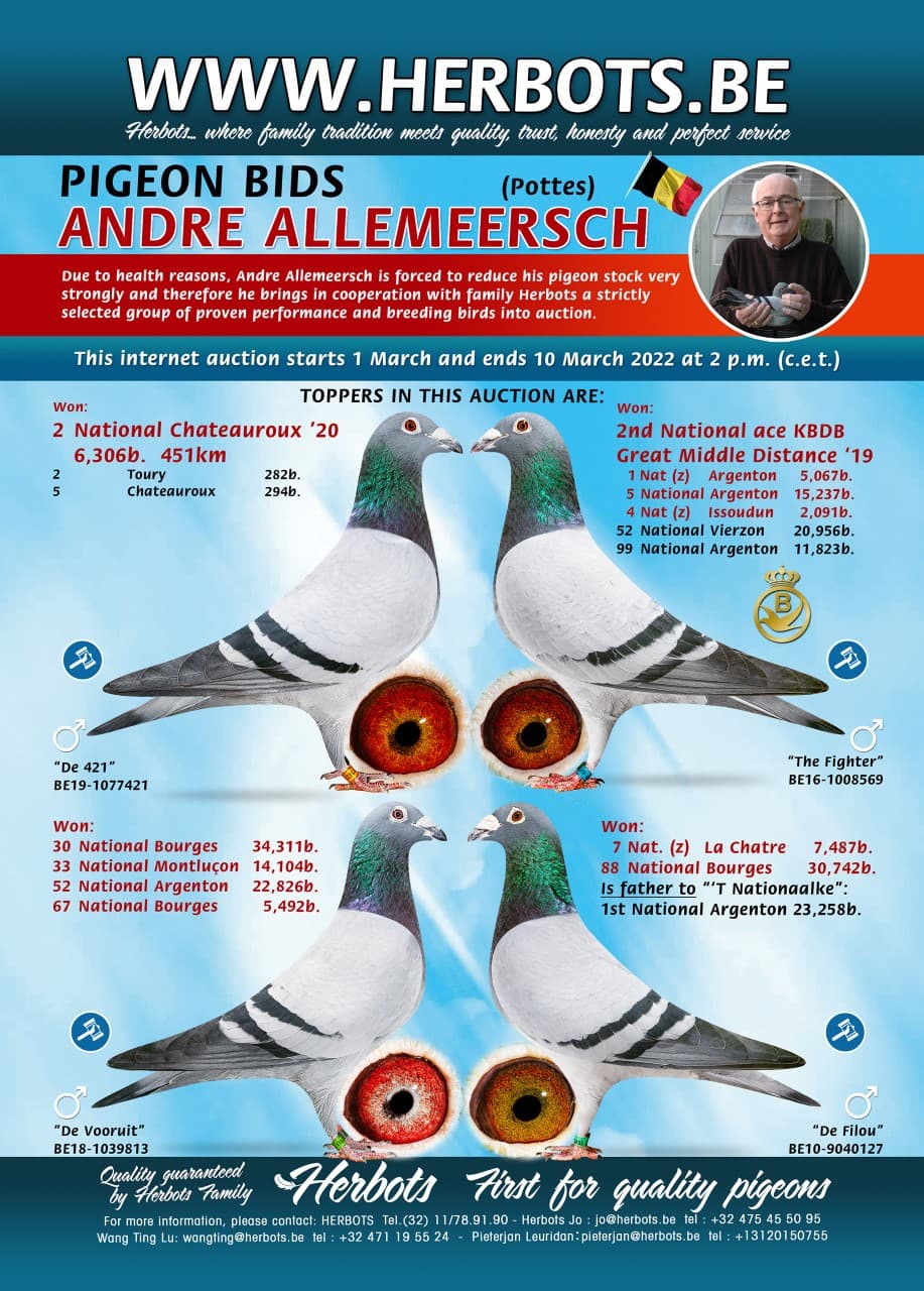 Due to health reasons, Andre Allemeersch is forced to reduce his pigeon stock very strongly and therefore he brings in cooperation with family Herbots a strictly selected group of proven performance and breeding birds into auction.