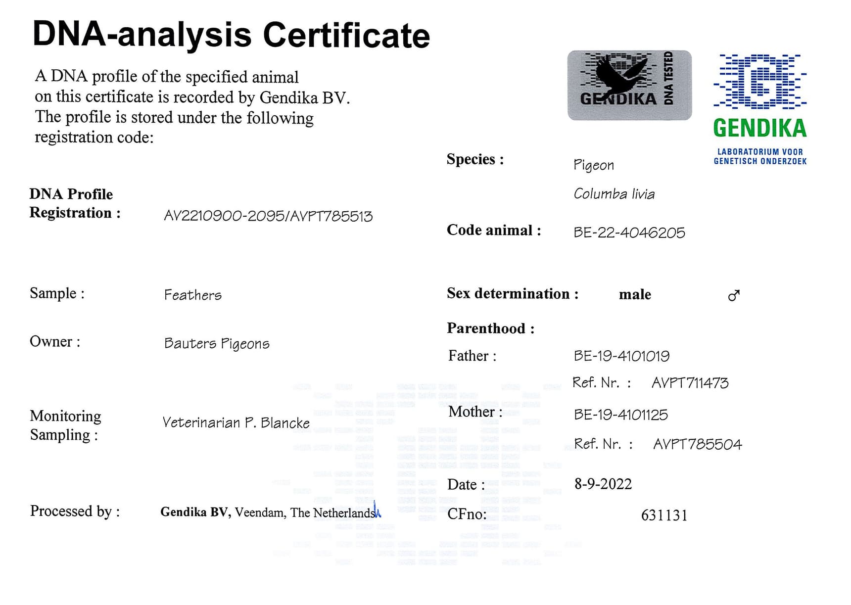 Direct daughter “Basso” (3rd prov. ace KBDB Fond youngbirds ’15) x “Lady Fabian” (daughter base breeder “Fabian”)