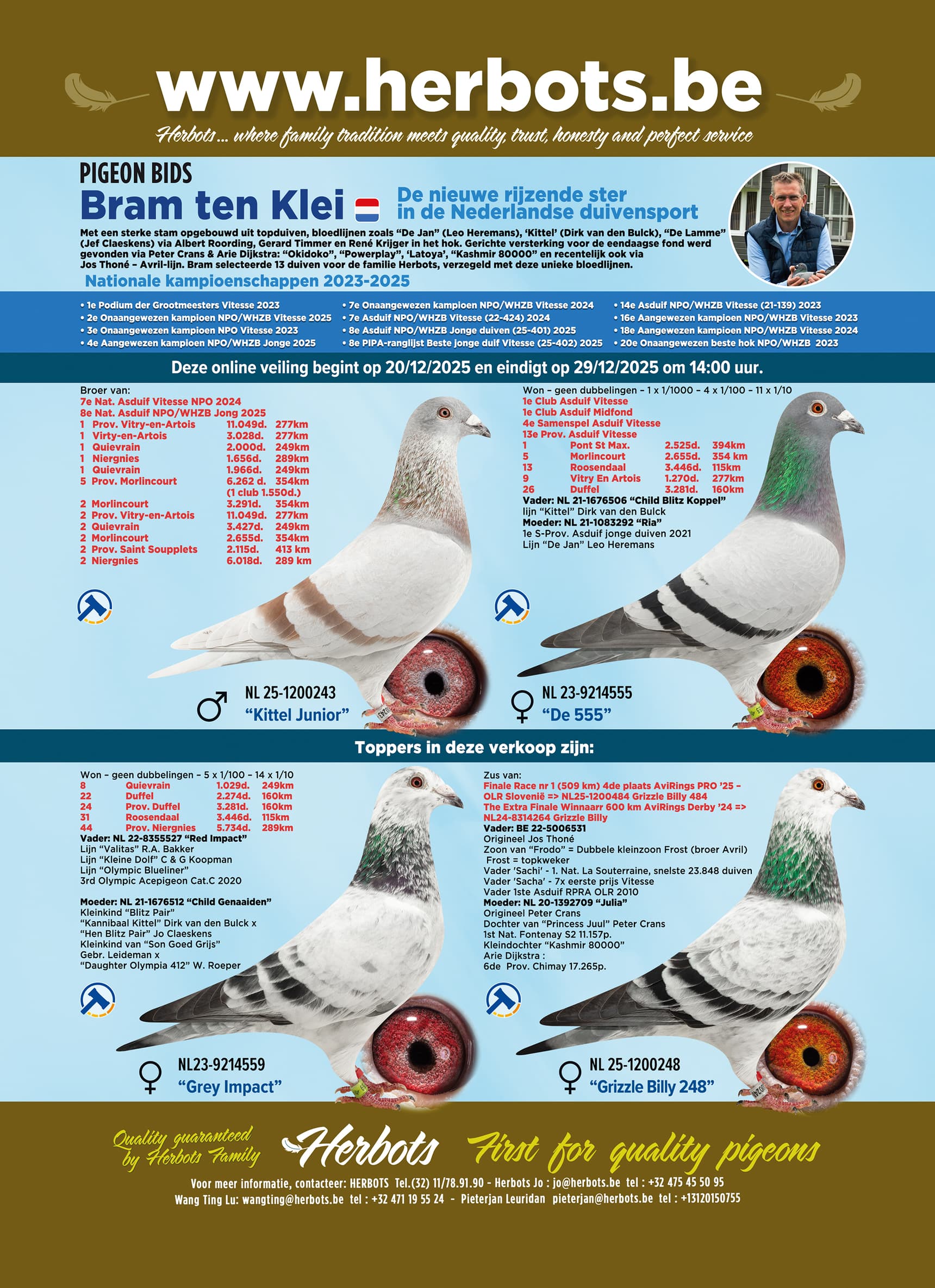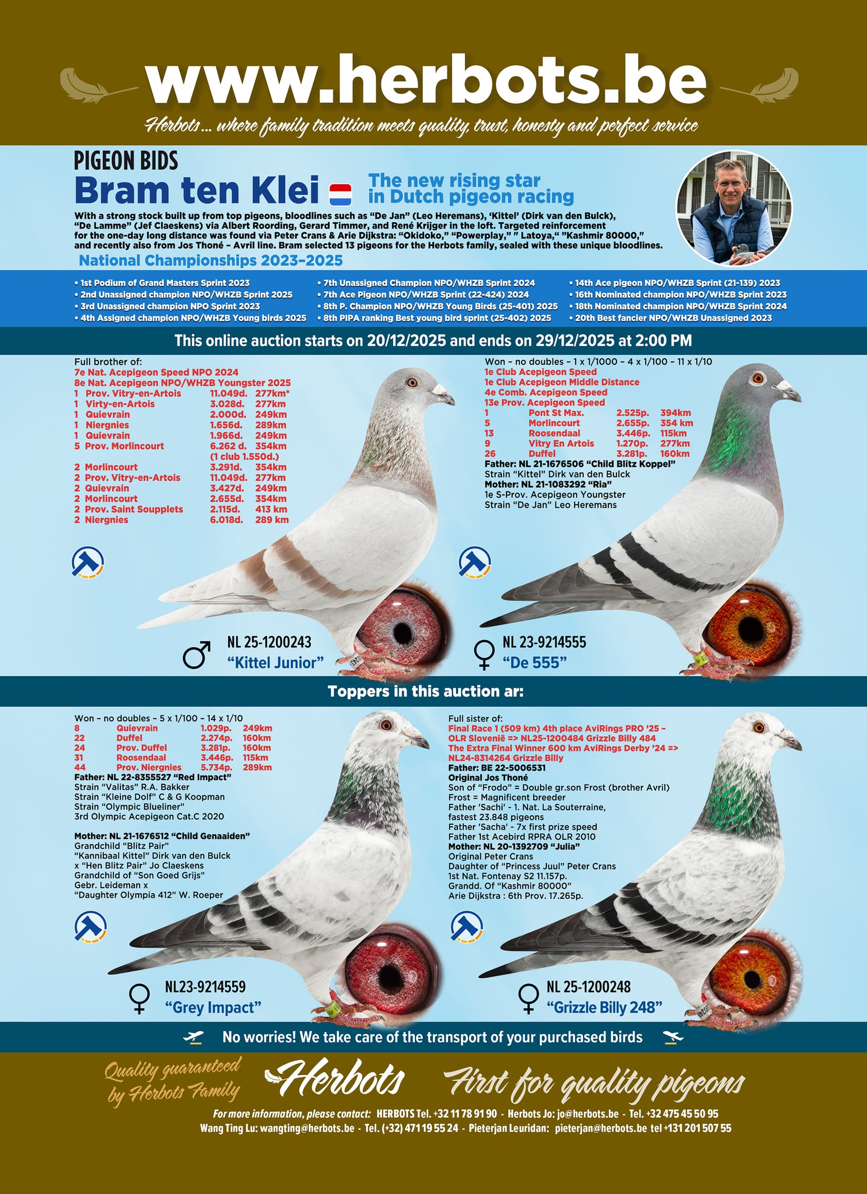 With a strong stock built up from top pigeons, bloodlines such as “De Jan” (Leo Heremans), ‘Kittel’ (Dirk van den Bulck), “De Lamme” (Jef Claeskens) via Albert Roording, Gerard Timmer, and René Krijger in the loft. Targeted reinforcement for the one-day long distance was found via Peter Crans & Arie Dijkstra: “Okidoko,” “Powerplay,” " Latoya,“ ”Kashmir 80000," and recently also from Jos Thoné – Avril line. Bram selected 13 pigeons for the Herbots family, sealed with these unique bloodlines.