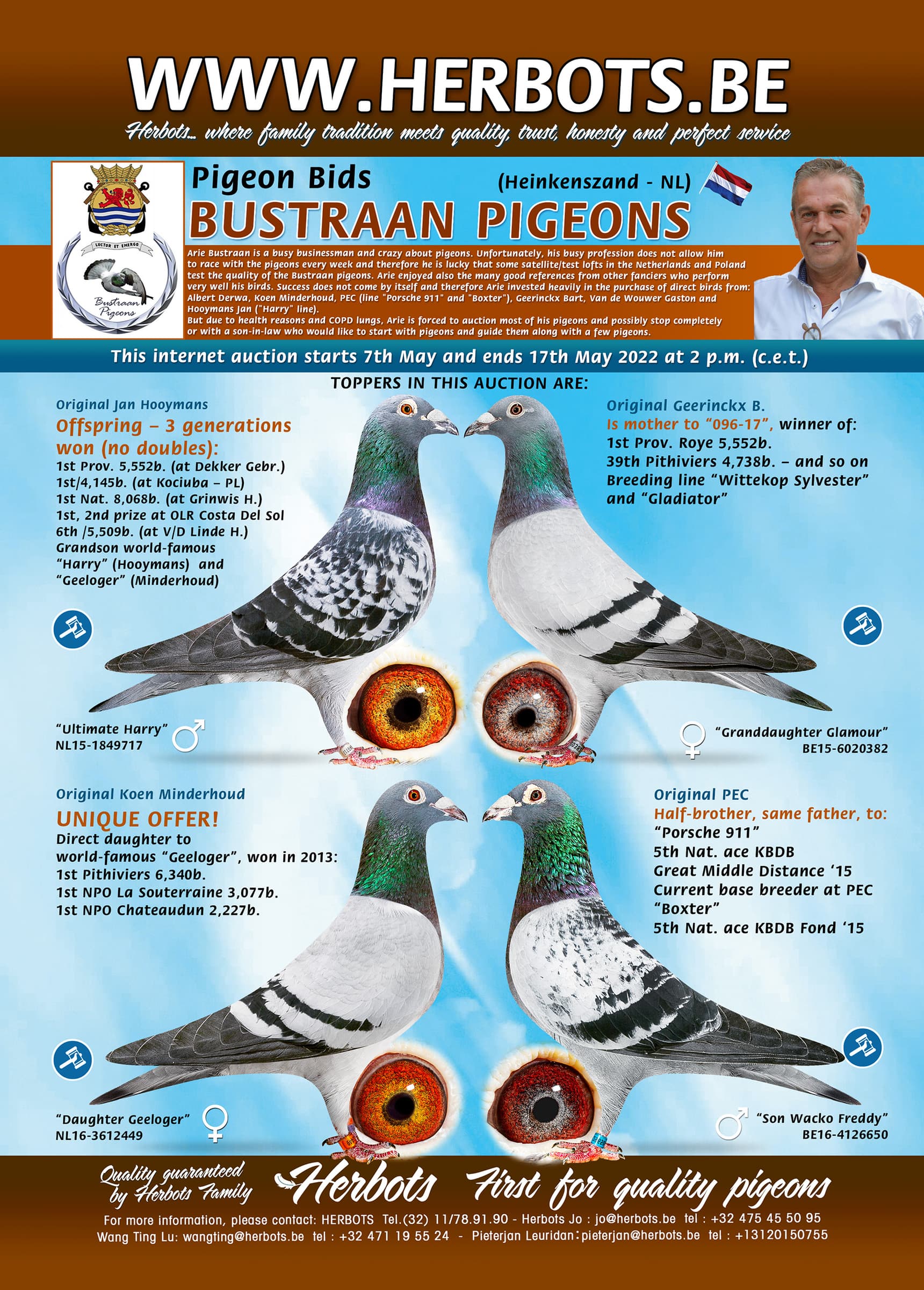 Both Arie Bustraan and the Herbots team stand 100% behind this unique offer of quality pigeons.