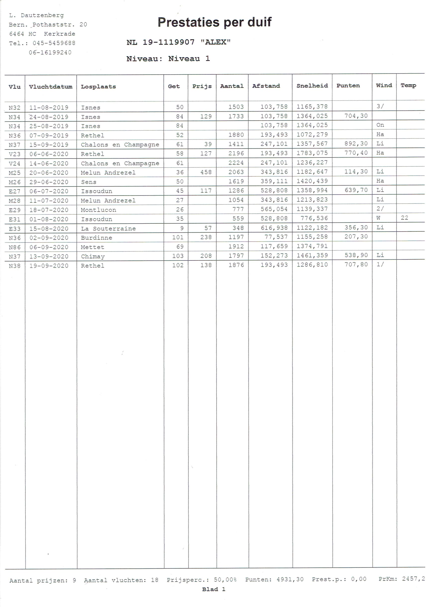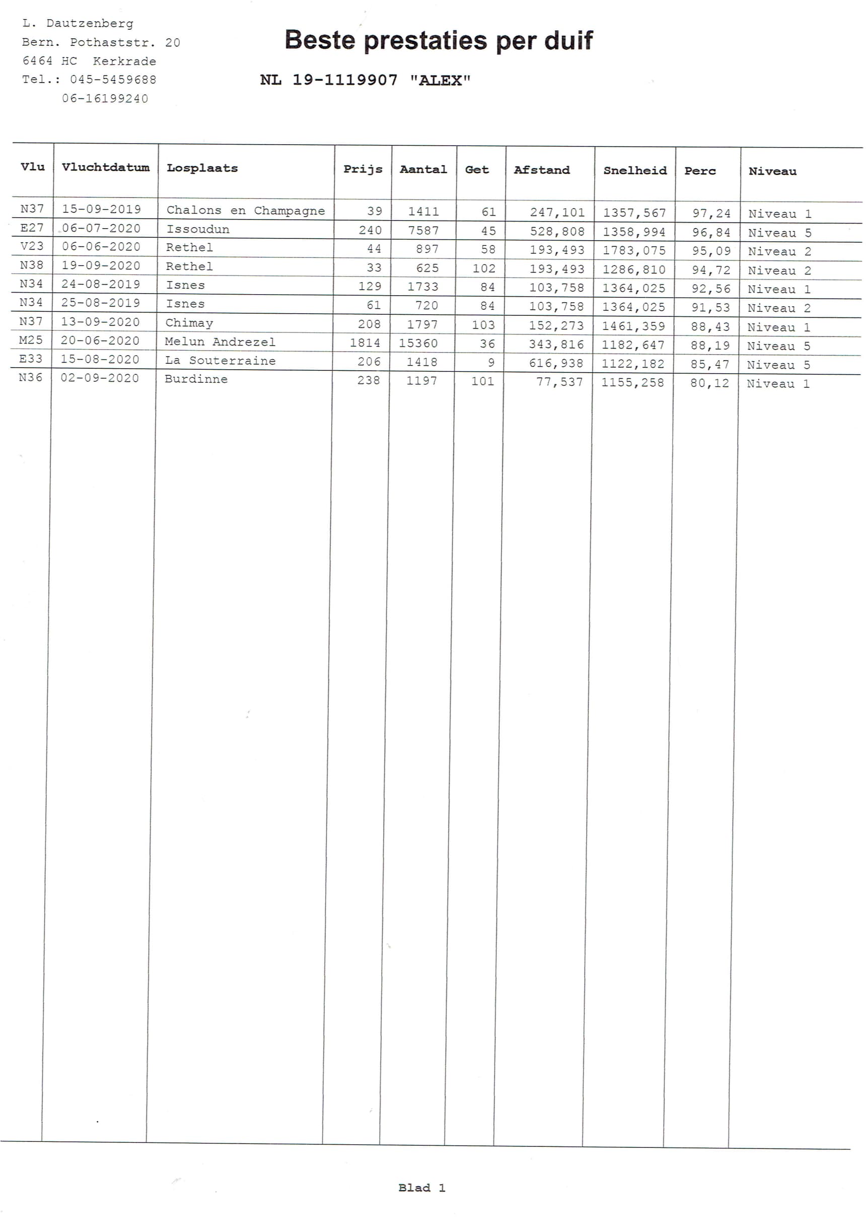 Full brother champion hen “Leontien”. “Leontien” raced by Dautzenbergbut now owned by Hooymans – won 4th NPO Bourges 8,278b., 4th NPO Gien 5,166b., 4th NPO Gien 4,177b., 59th Prov. Lorris 10,389b.