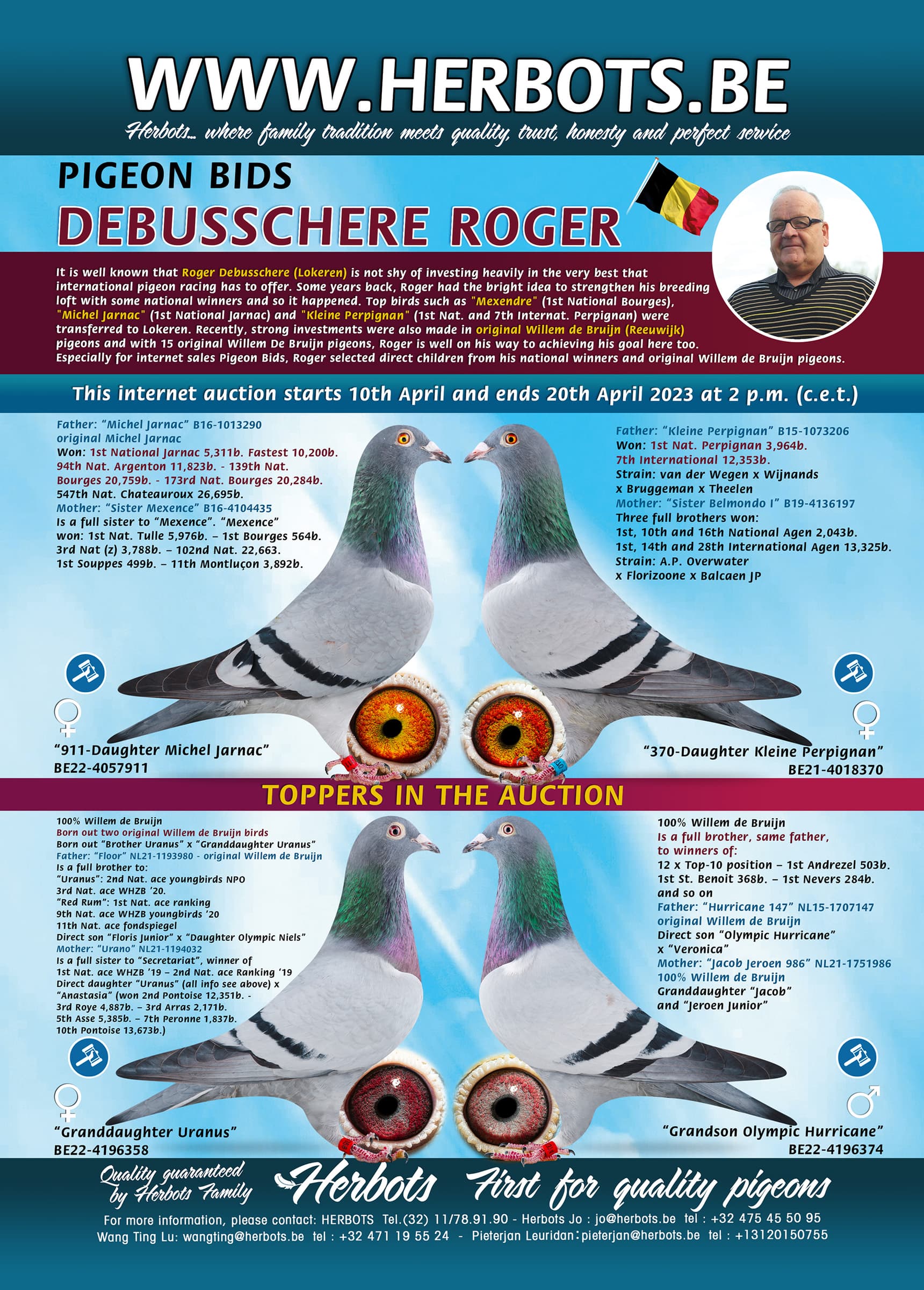 Especially for internet sales Pigeon Bids, Roger selected direct children from his national winners and original Willem de Bruijn pigeons.