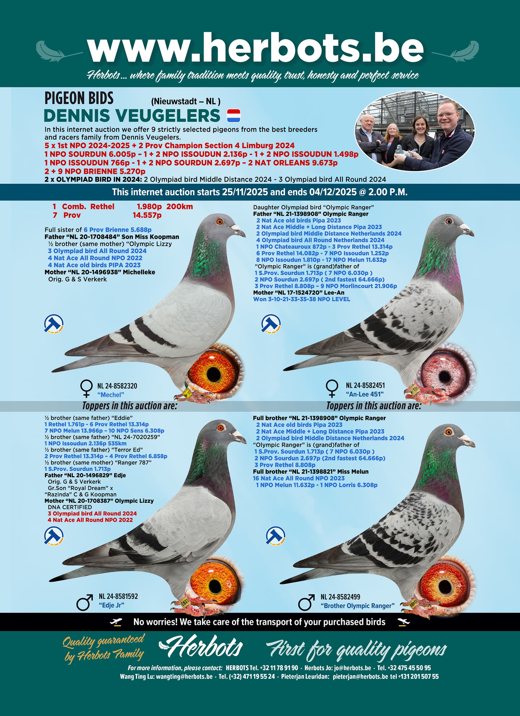 In this internet auction we offer 9 strictly selected pigeons from the best breeders and racers family from Dennis Veugelers.