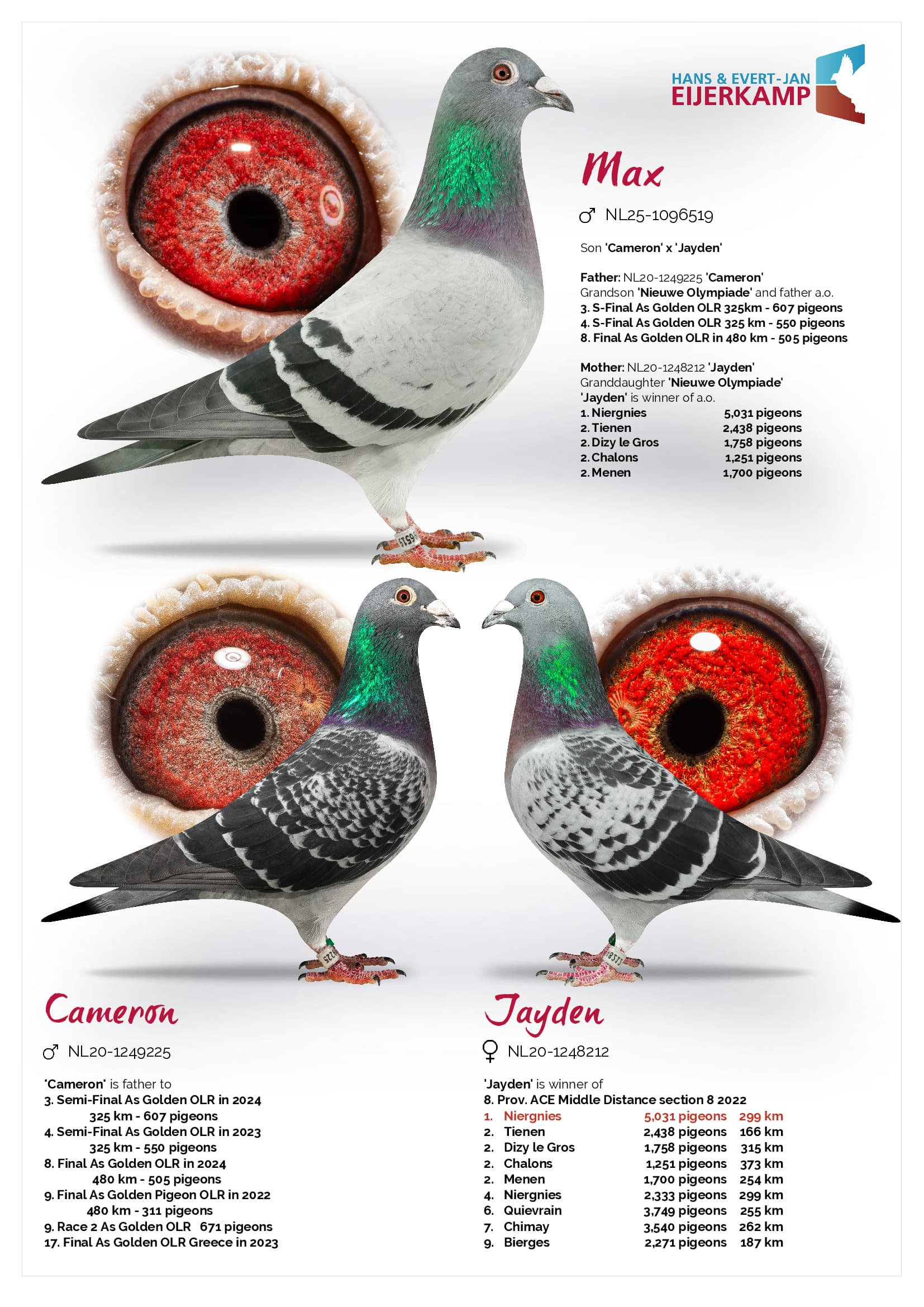 Born out “Diamant” (8 x 1st – original Van den Brande Gebr.) x “Stellenbosch” (daughter “Nieuwe Olympiade” x “Kim”)