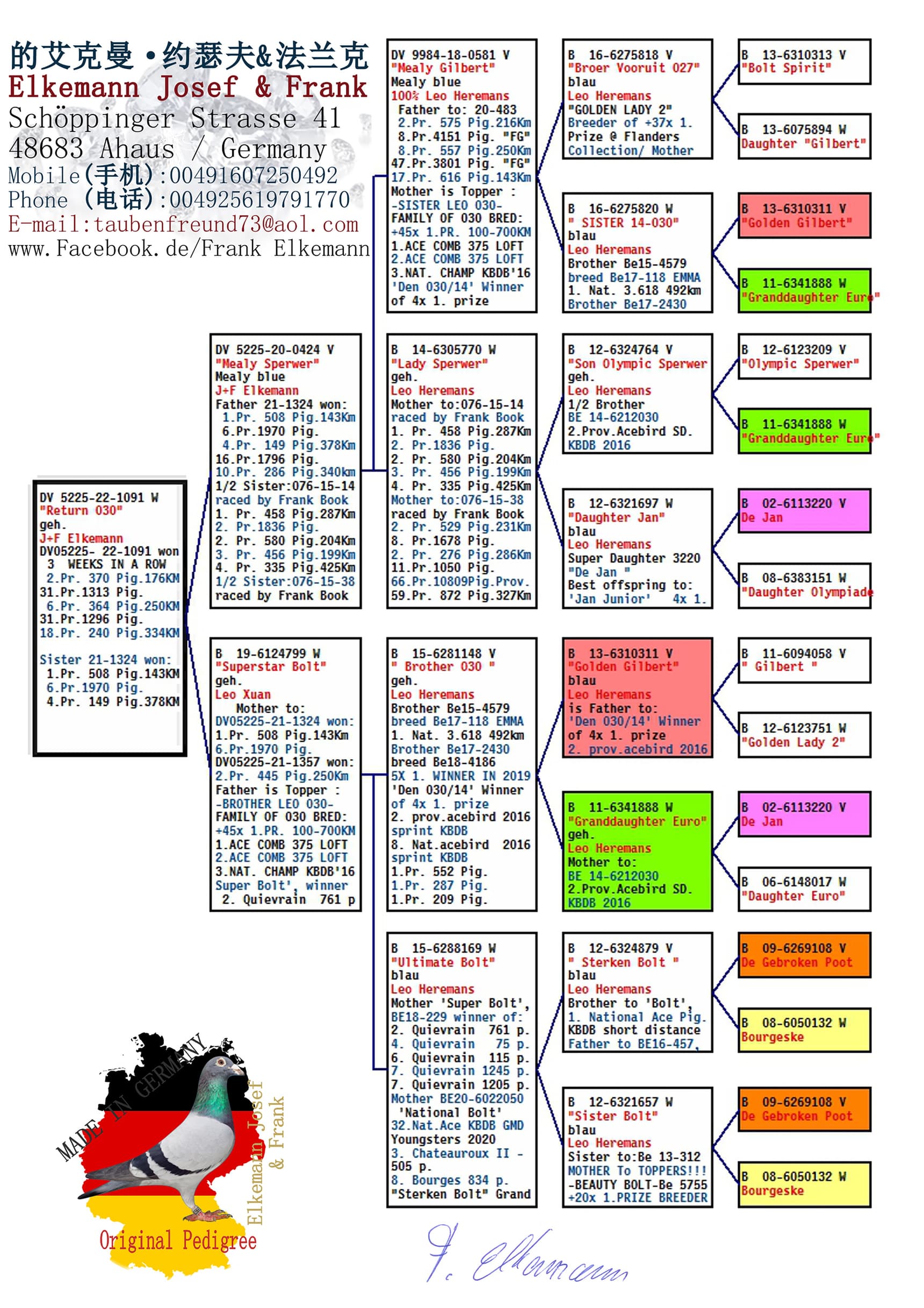 Born out “Broer Vooruit 027” (original Leo Heremans – grandson “Gebroken Poot” x “Bourgeske” – grandson “Gilbert” x “Golden Lady 2) x “B16-6275820” (original Leo Heremans - granddaughter “Gilbert” x “Golden Lady 2”)