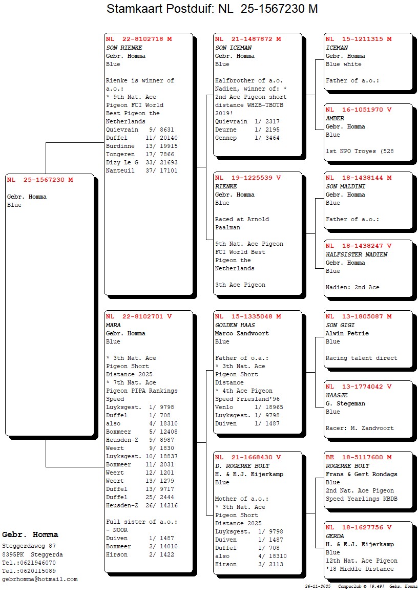 Son of “Rienke”= winner of 9th Nat Ace Pigeon FCI WBP