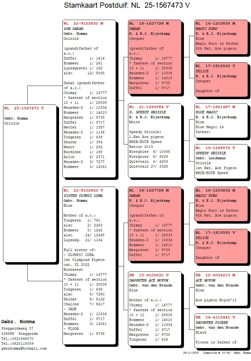 Son of “Magic Euro” x “Felice” H & E.J. Eijerkamp. “Magic Euro” = father of 6th Nat. ace pigeon natour WHZB 2019 – 1 Chimay 14.777p. –