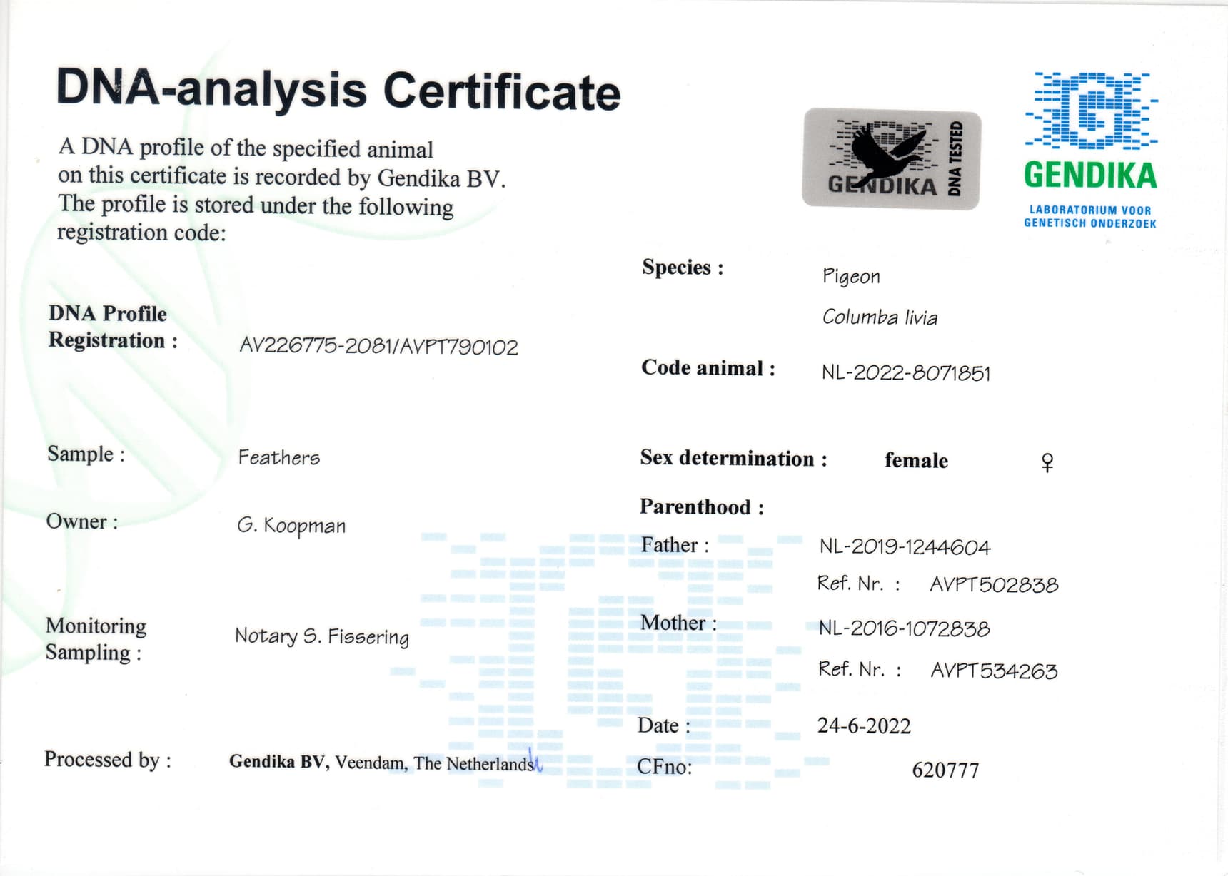 Is a half-sister to “Bert Junior” (1st NPO Chateaudun - 9th NPO Chateauroux) - “Alawa” (3rd Rethel 4,692b., 5th Bourges 3,734b. - 6th Chateauroux 2,566b.) - “Believer” (1st Nat. ace Fondspiegel 2011-2013 Cat. E/F) “Fahsai”: 1st NPO Sens 4,237b. - “Sifan” (fastest Sens Sector 10-11 against 10,701b.)