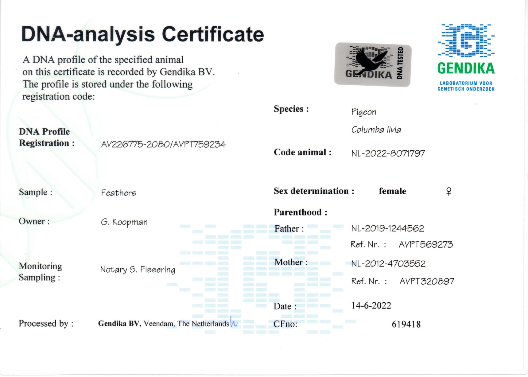 Is grandmother to: “Manu Victoria” (10th Final race 600 km VFWCPR '21) – “Winson” (4th and 9th NPO winner) - “Jemina” (6th NPO Lorris 3,455b.) – “Marvat” (4th NPO Sourdun 3,375b.)