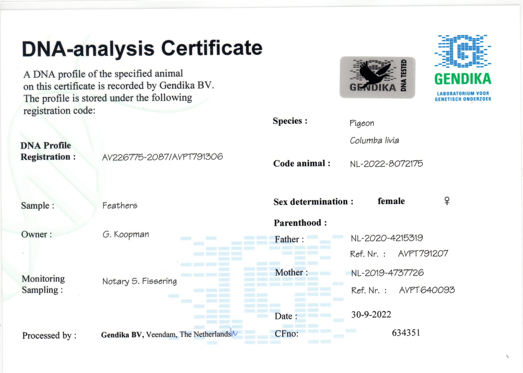 Is a half-sister to “Sigrid” (4th and 5th NPO winner)  - “Max” (8th and 14th NPO winner) - “Reinier” (top performing OLR bird South-Africa) – “Cumano” (3rd NPO Sourdun 5,475b.)