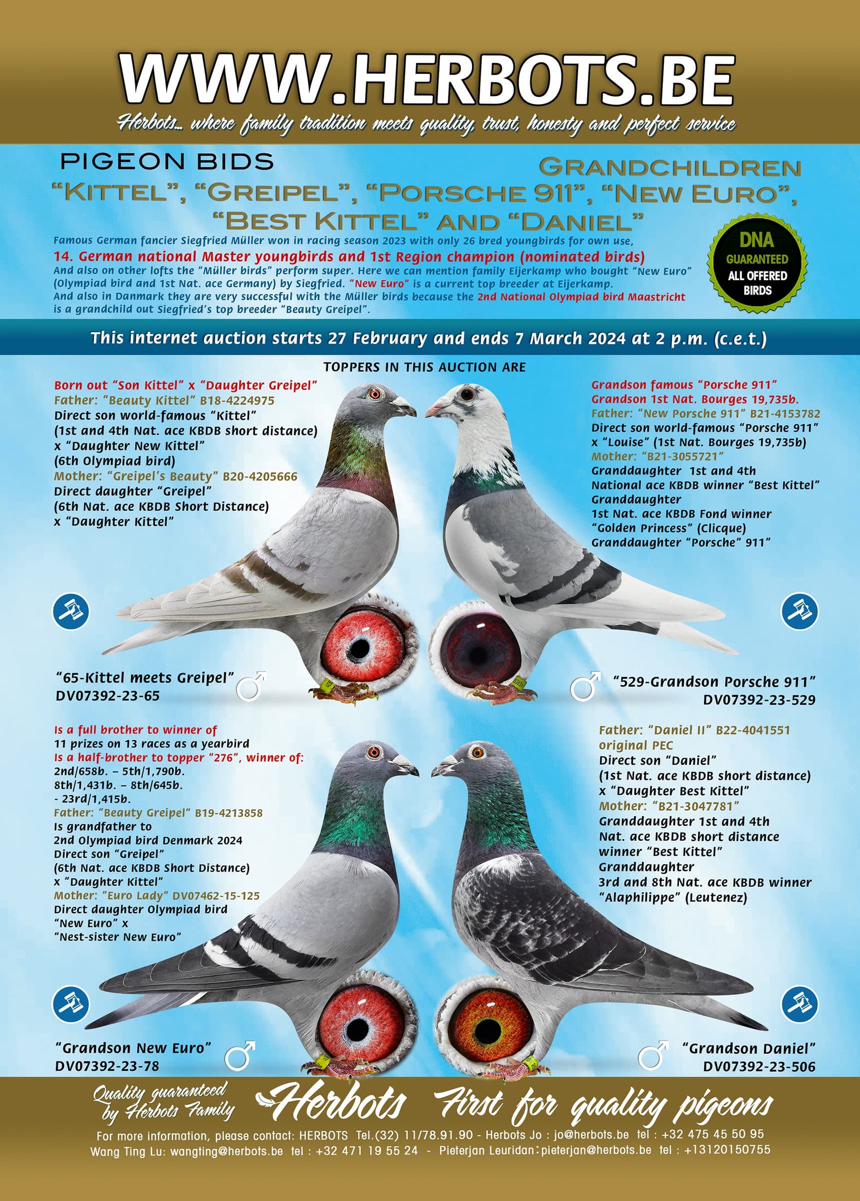 In this auction German champion breeder Siegfried Müller offers grandchildren of famous KBDB ace birds such as