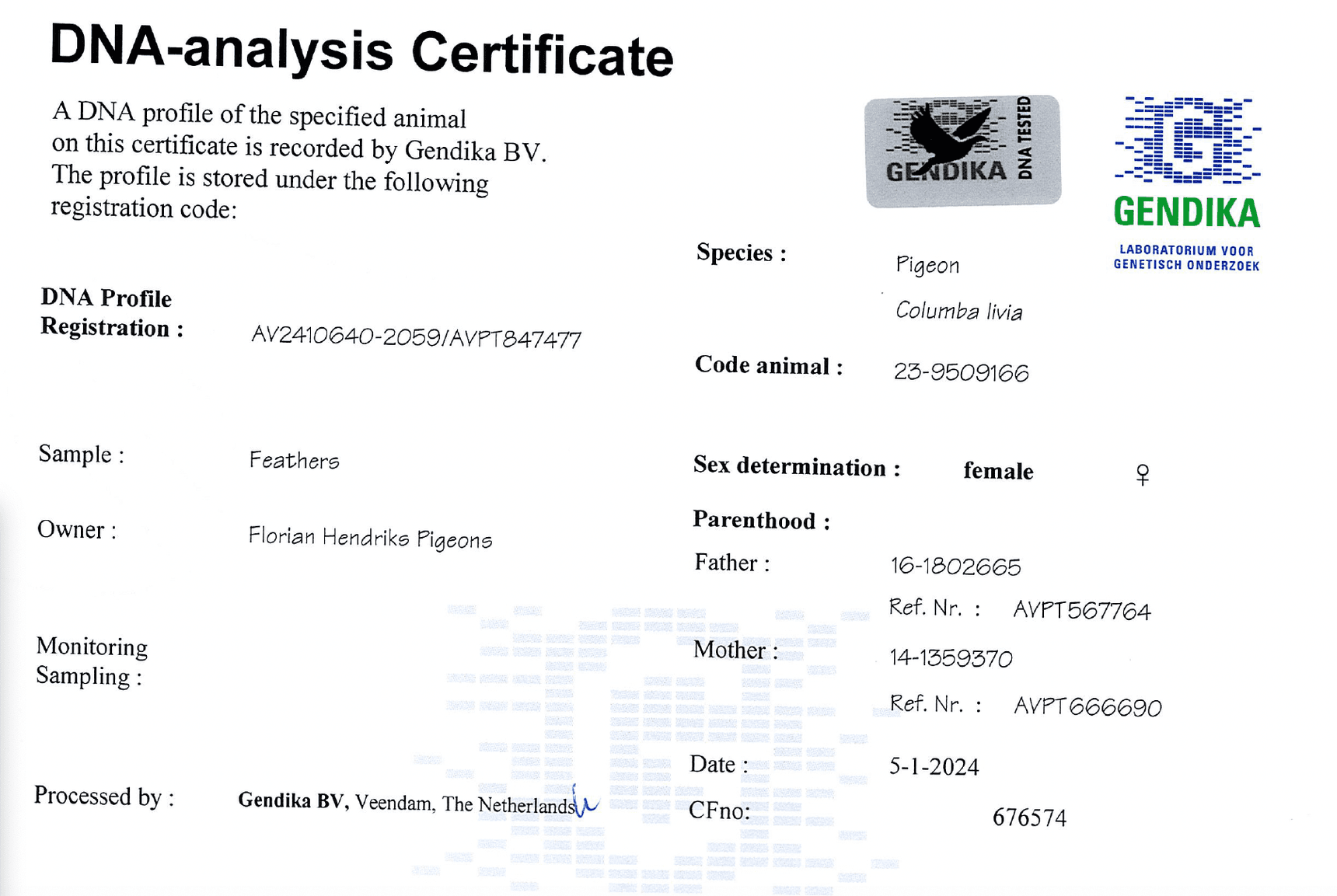 Direct daughter of champion bird “King Kong” (won on prov. level: 2nd prov. Orleans 6,296b. – 4th prov. Pithiviers 11,213b. – 5th Prov. Epernay 15,241b. – 6th prov. Sezanne 12,324b. – 7th prov. Charleville 13,544b. – 8th prov. Sens 14,291b. – 15th prov. Rethel 15,201b. – 15th prov. Sens 13,767b.) x “Daughter Harry” (born out world-famous “Harry” x “Daughter Alexia”)