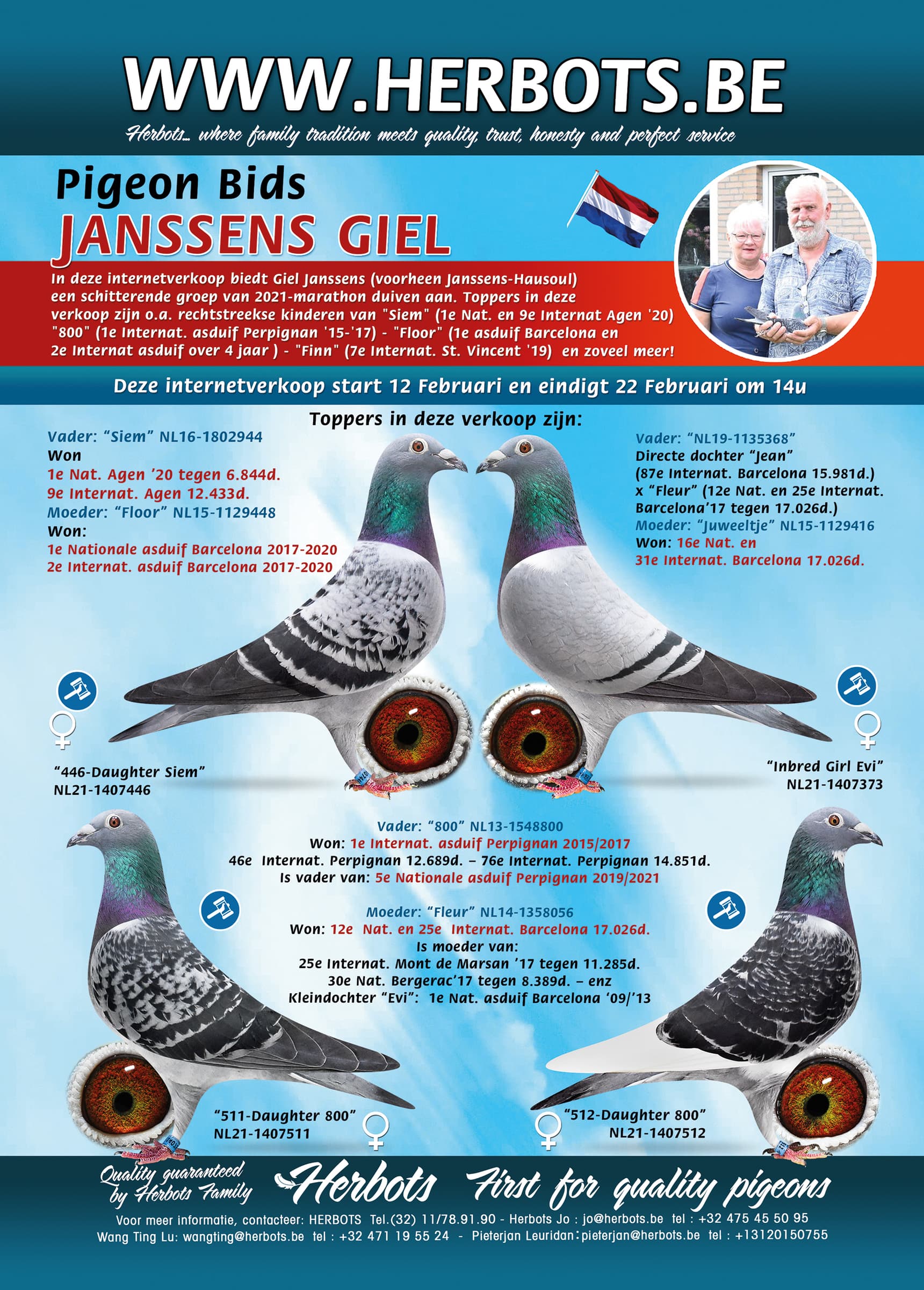 In this internetauction Giel Janssens (before Giel raced together with Jean Hausoul under the name Janssens-Hausoul) offers a superb group of "2021 marathon birds".