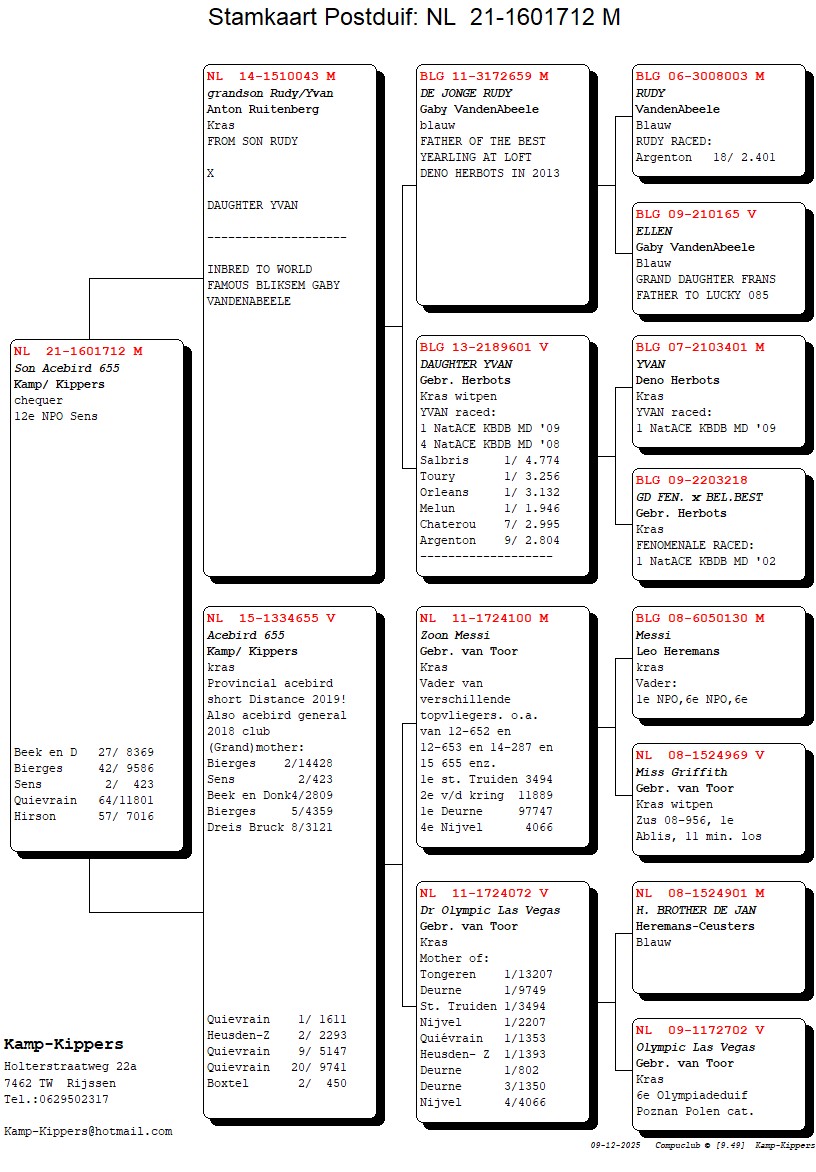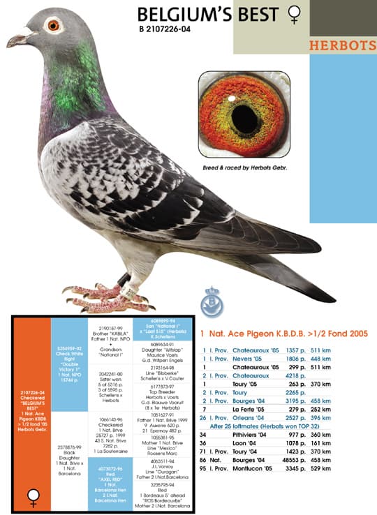 Grandson of “Rudy” Gaby Vandenabeele. “Rudy” father to: “New Bliksem” 1e Nat. Tulle YL - “Super Romeo” 1e Nat. Ace Pigeon L.D. YL K.B.D.B.