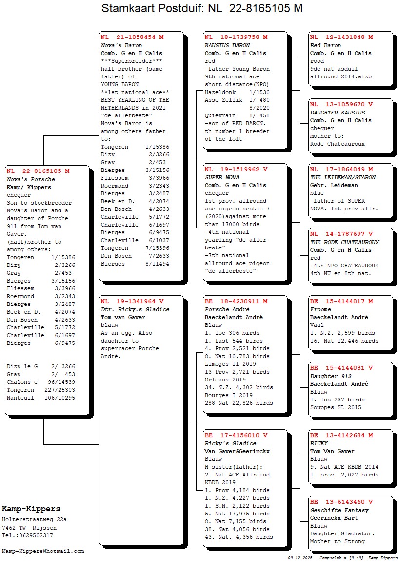 9th Nat. Ace Pigeon KBDB 2014 - ½ Sister to: “Little Ricky” 2e Olympic Bird Cat. C 19-20 – 2e Nat. Ace Pigeon Allround KBDB 2019