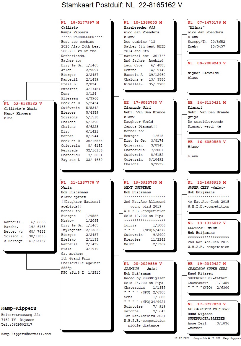 “Basebreeder 053” Nico Jan Koenders = Father of 4th Best Pigeon WHZB 2014 – 8th Nat. Ace Pigeon 2017. Father of: 6e Laon 4.885p. – 14e Deurne 9.749p.