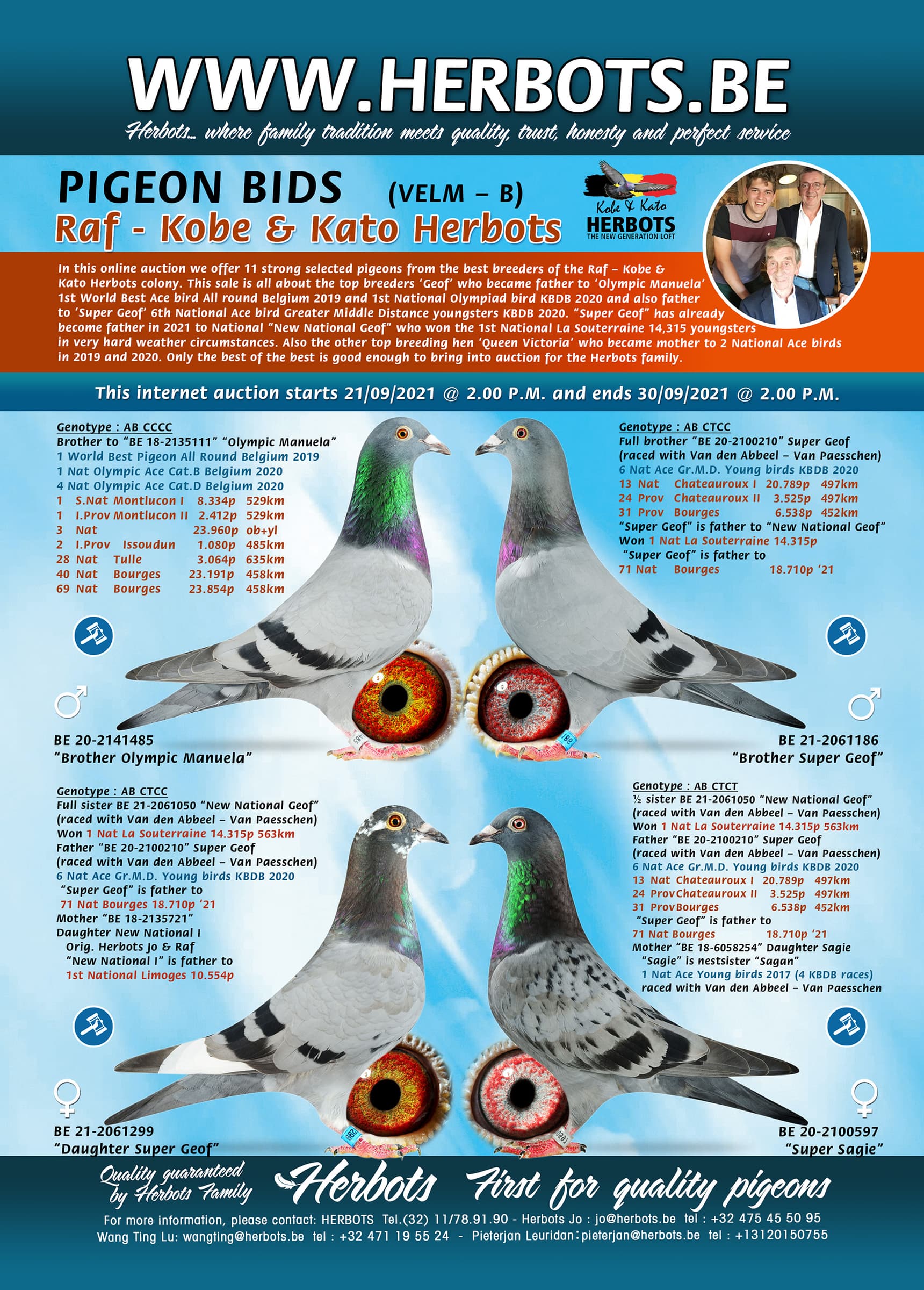 In this online auction we offer 11 strong selected pigeons from the best breeders of the Raf – Kobe & Kato Herbots colony. This sale is all about the top breeders ‘Geof’ who became father to ‘Olympic Manuela’ 1st World Best Ace bird All round Belgium 2019 and 1st National Olympiad bird KBDB 2020 and also father to ‘Super Geof’ 6th National Ace bird Greater Middle Distance youngsters KBDB 2020. “Super Geof” has already become father in 2021 to National “New National Geof” who won the 1st National La Souterraine 14,315 youngsters in very hard weather circumstances. Also the other top breeding hen ‘Queen Victoria’ who became mother to 2 National Ace birds in 2019 and 2020. Only the best of the best is good enough to bring into auction for the Herbots family.