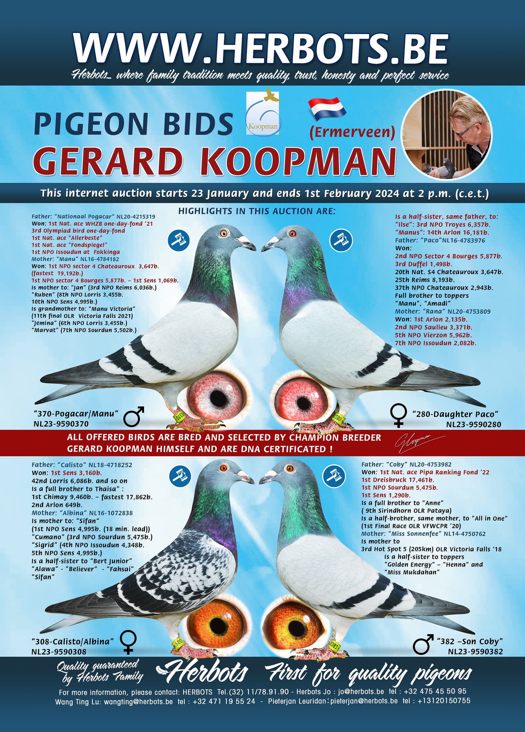 Fanciers Verkerk G. & S. (Reeuwijk) bred out a daughter of "Manu" topbird "NL22-8459329", who is 1st National ace old bird The Netherlands 2023