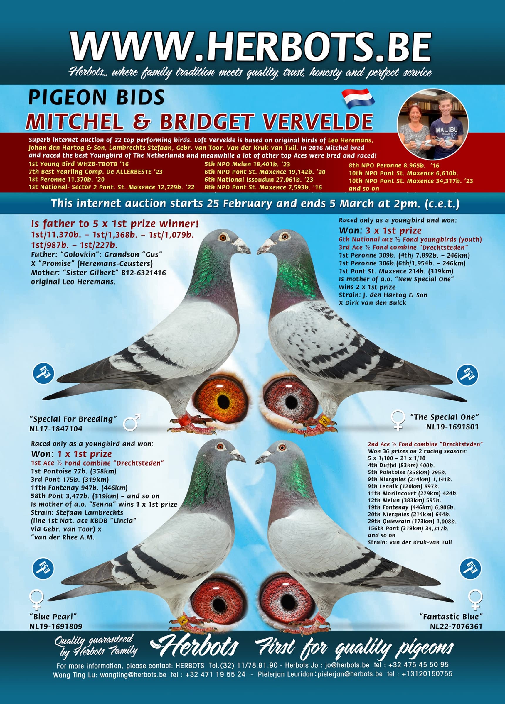 Superb internet auction of 22 top performing birds. Loft Vervelde is based on original birds of Leo Heremans, Johan den Hartog & Son, Lambrechts Stefaan, Gebr. van Toor, Van der Kruk-van Tuil.