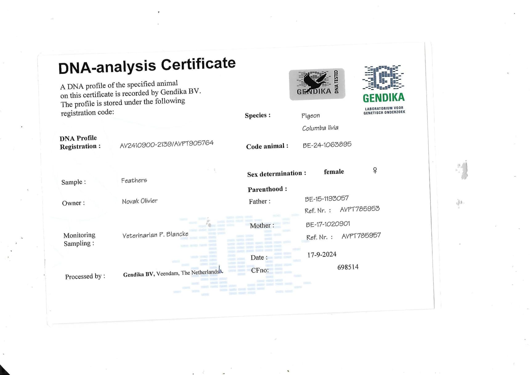 Born out “B14-1017562” (brother to 1st Nat. Montélimar at Flasse) x “B15-4256864” (original De Smeyter Restiaan – line “Gladiator”)
