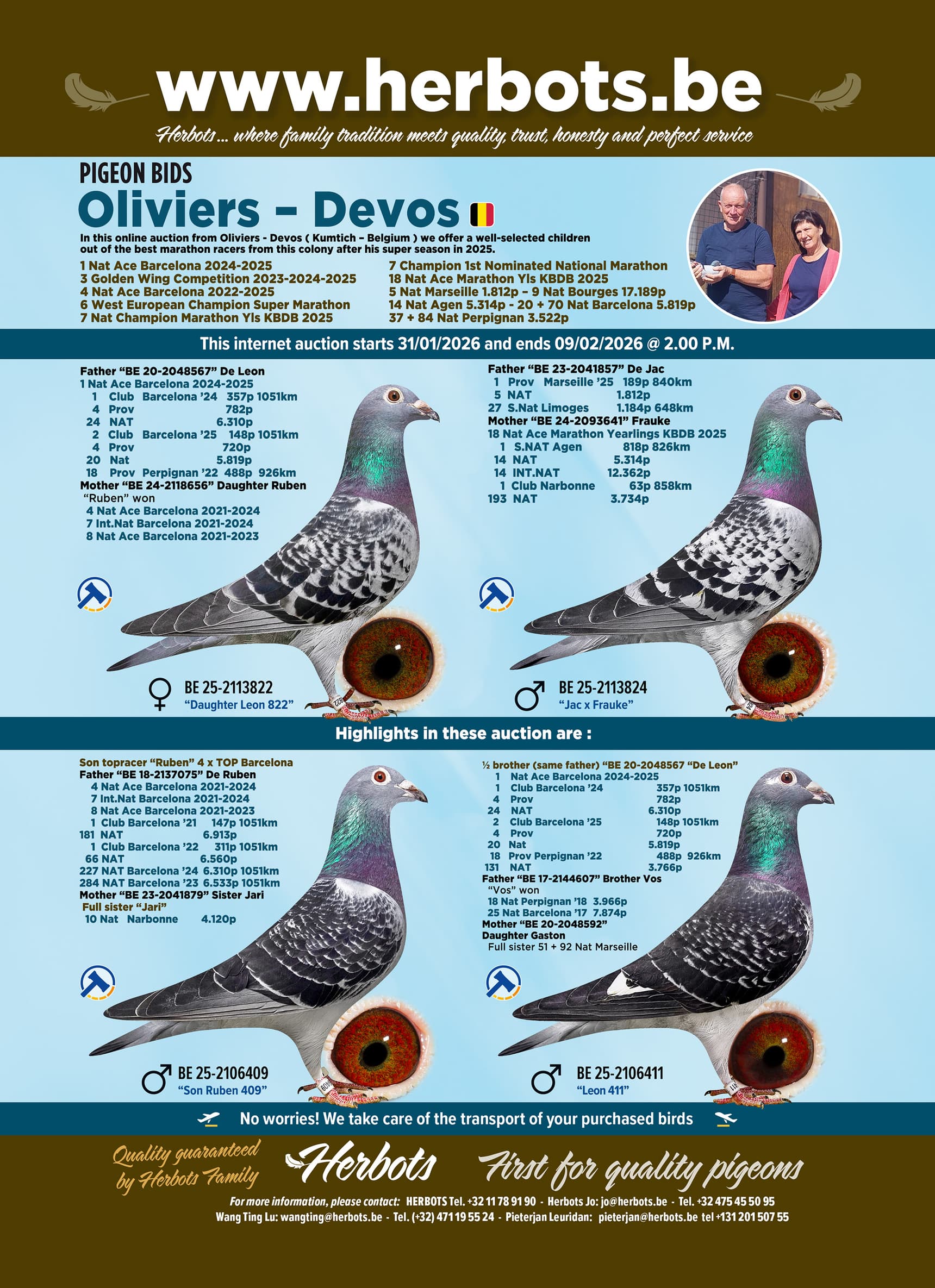 In this online auction from Oliviers - Devos ( Kumtich – Belgium ) we offer a well-selected children out of the best marathon racers from this colony after his super season in 2025.