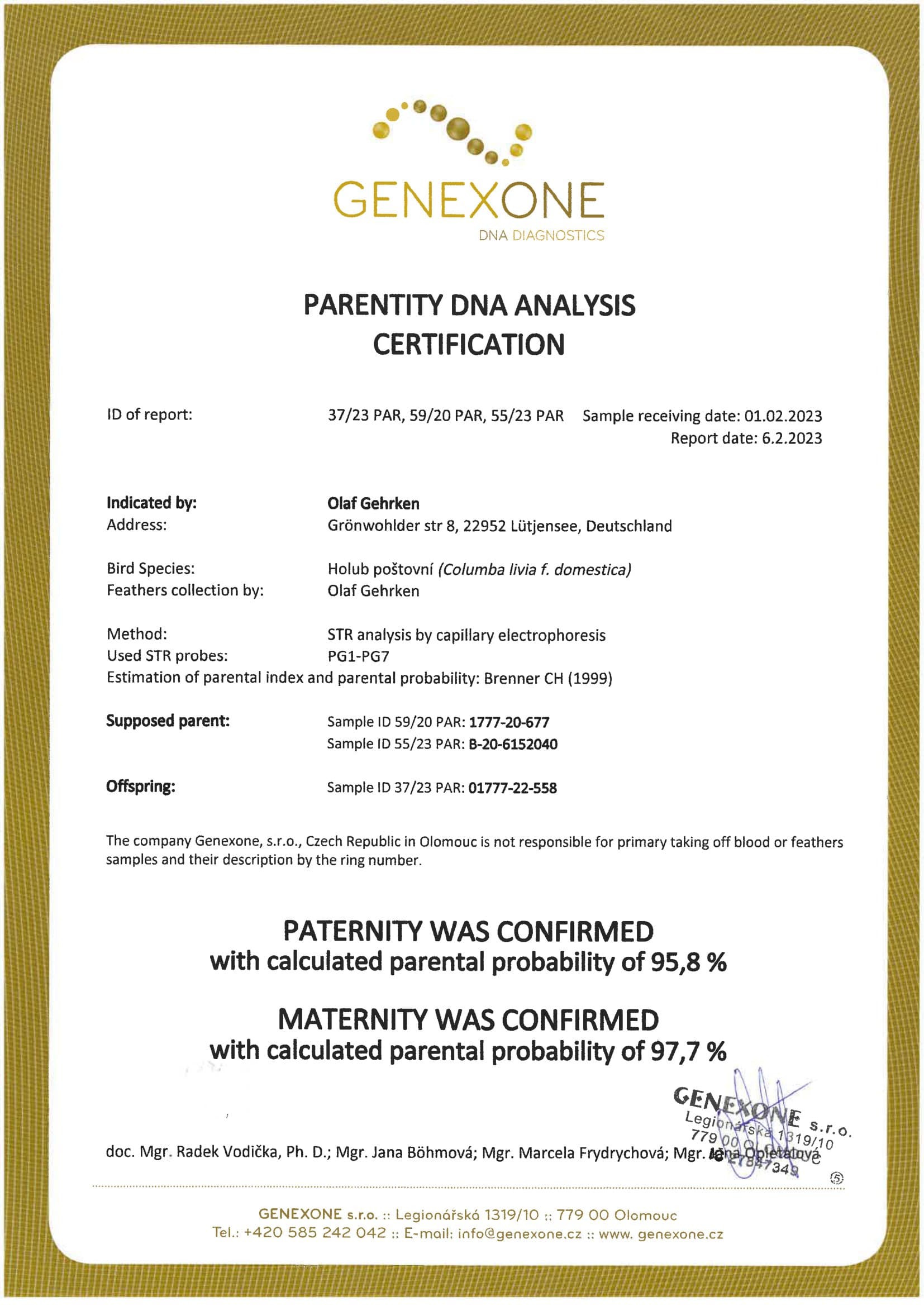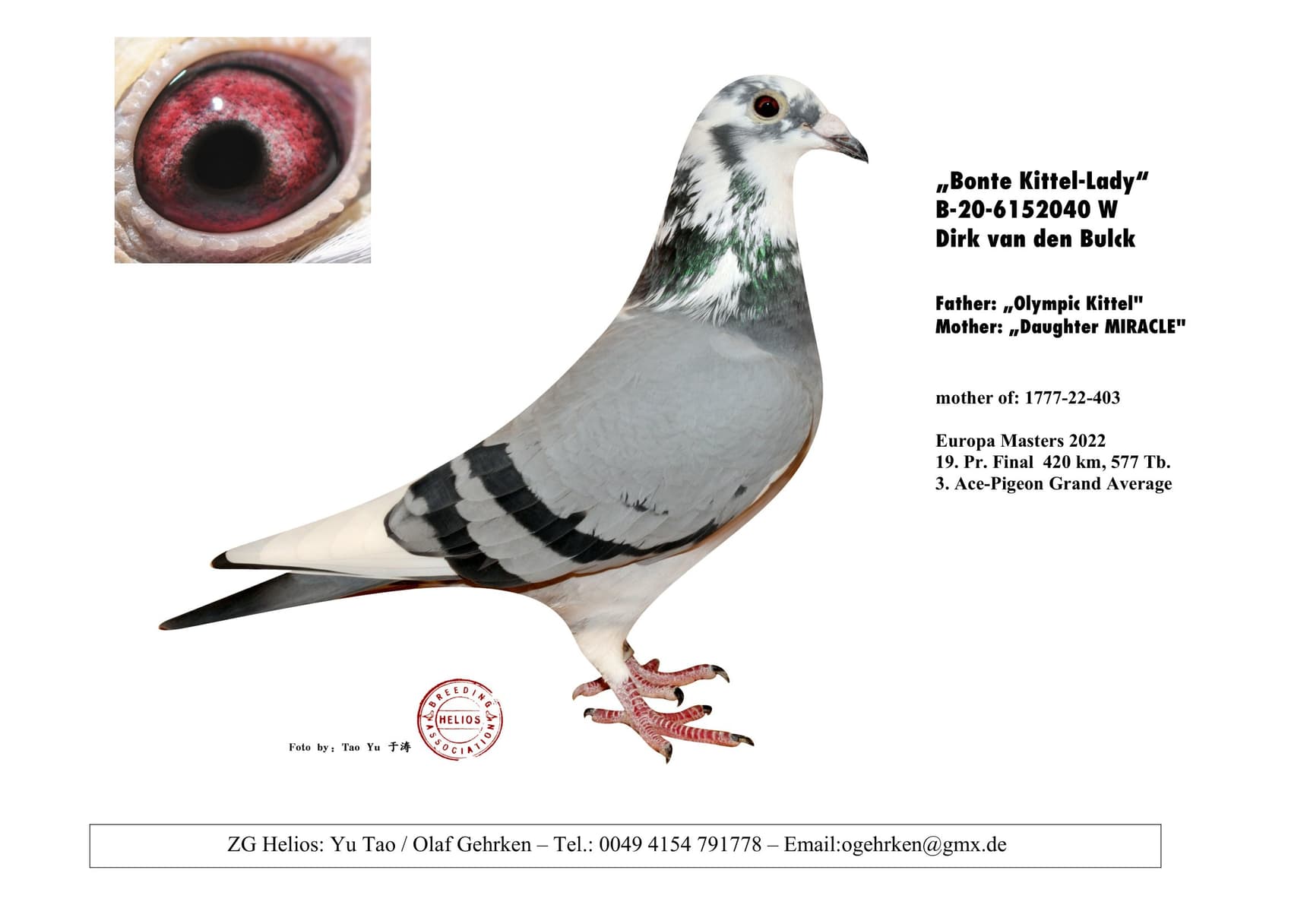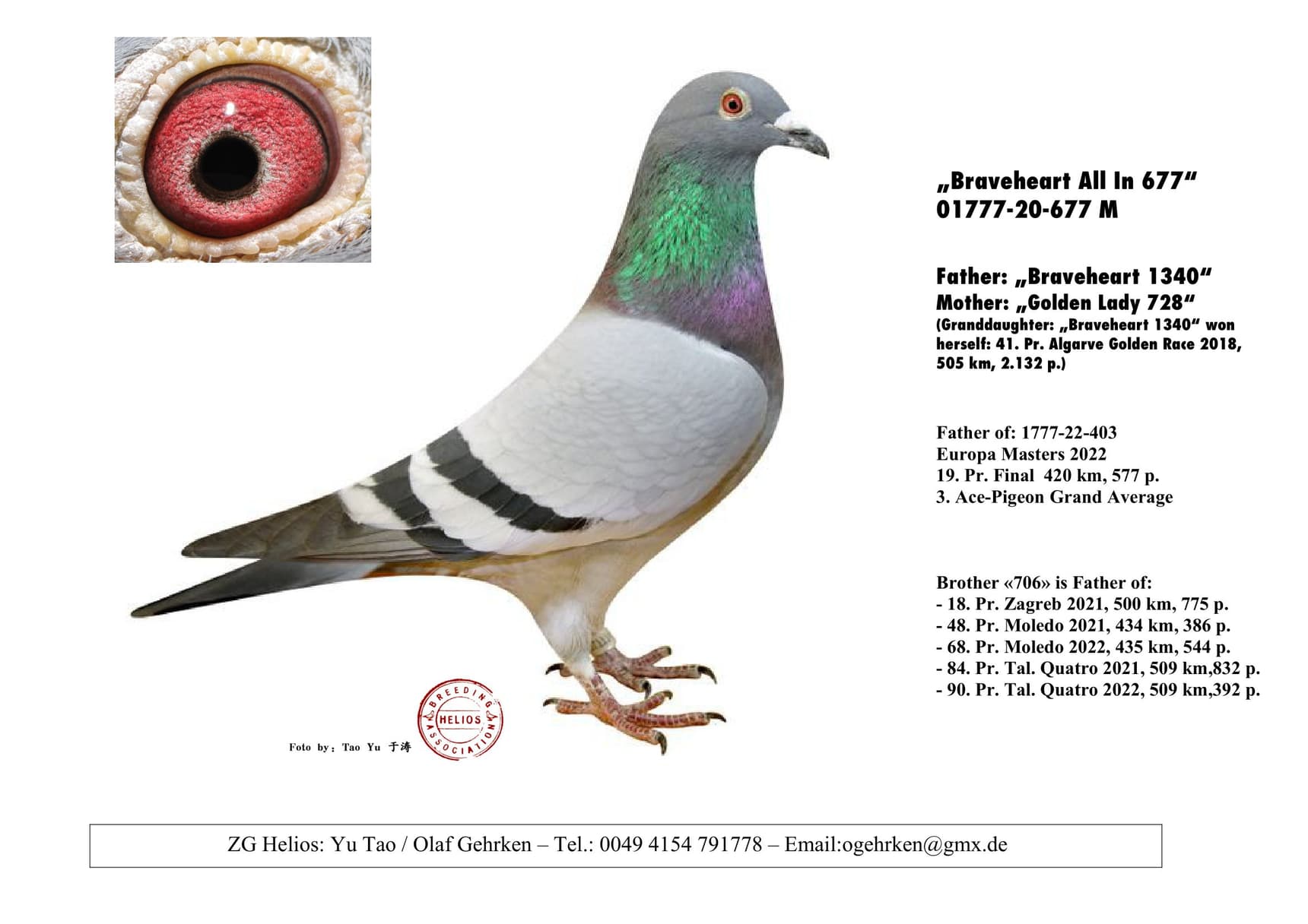 Direct son “Braveheart 1340” (original Willy Vanhoutte - is grandfather to 3 different 1st ace birds and 2 different 1st OLR Final race winners) x “Granddaughter Braveheart 1340” (won 41st prize OLR Algarve Golden Race 2018 – 2,132b.)