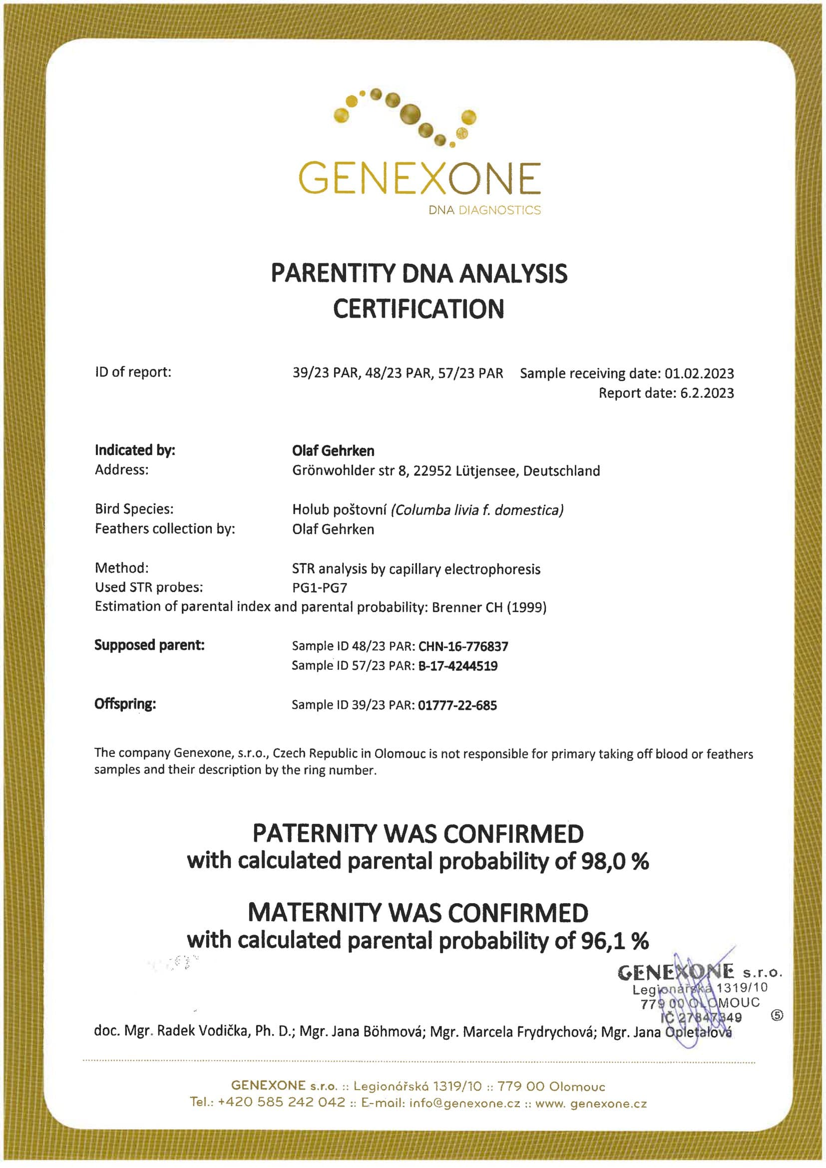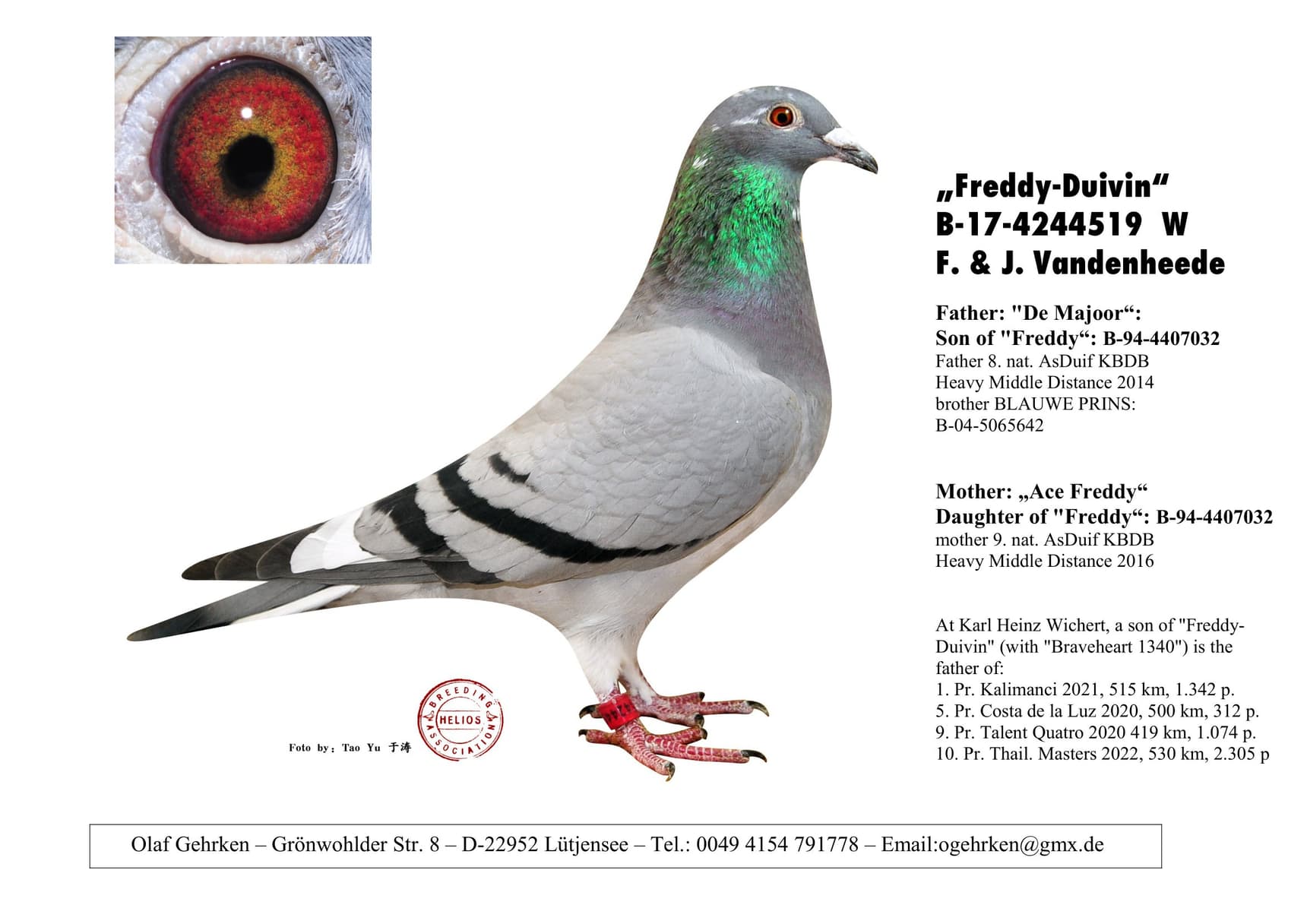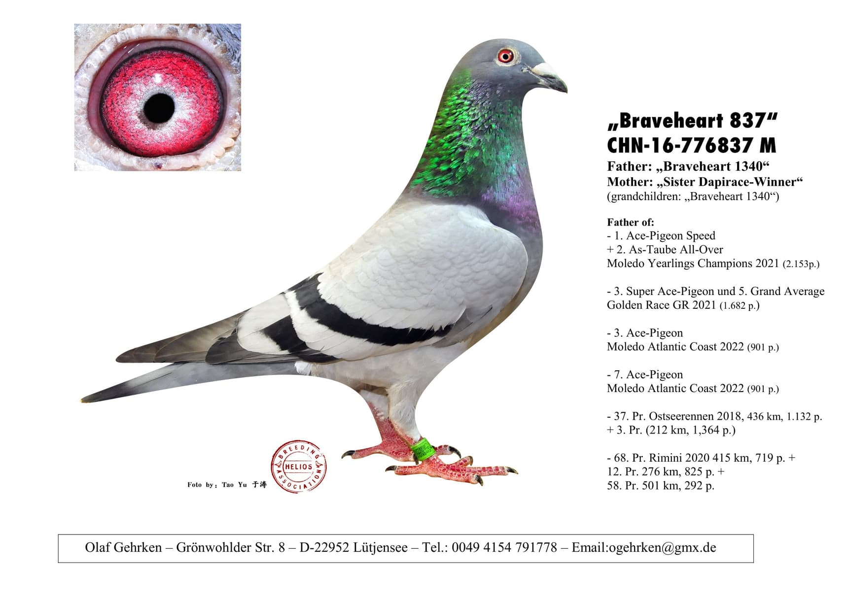 Born out “Braveheart 1340” (original Vanhoute W.) x “Sister Dapi Race Winner” (full sister to 1st prize OLR Dapirace 1,088b. – granddaughter “Braveheart 1340)