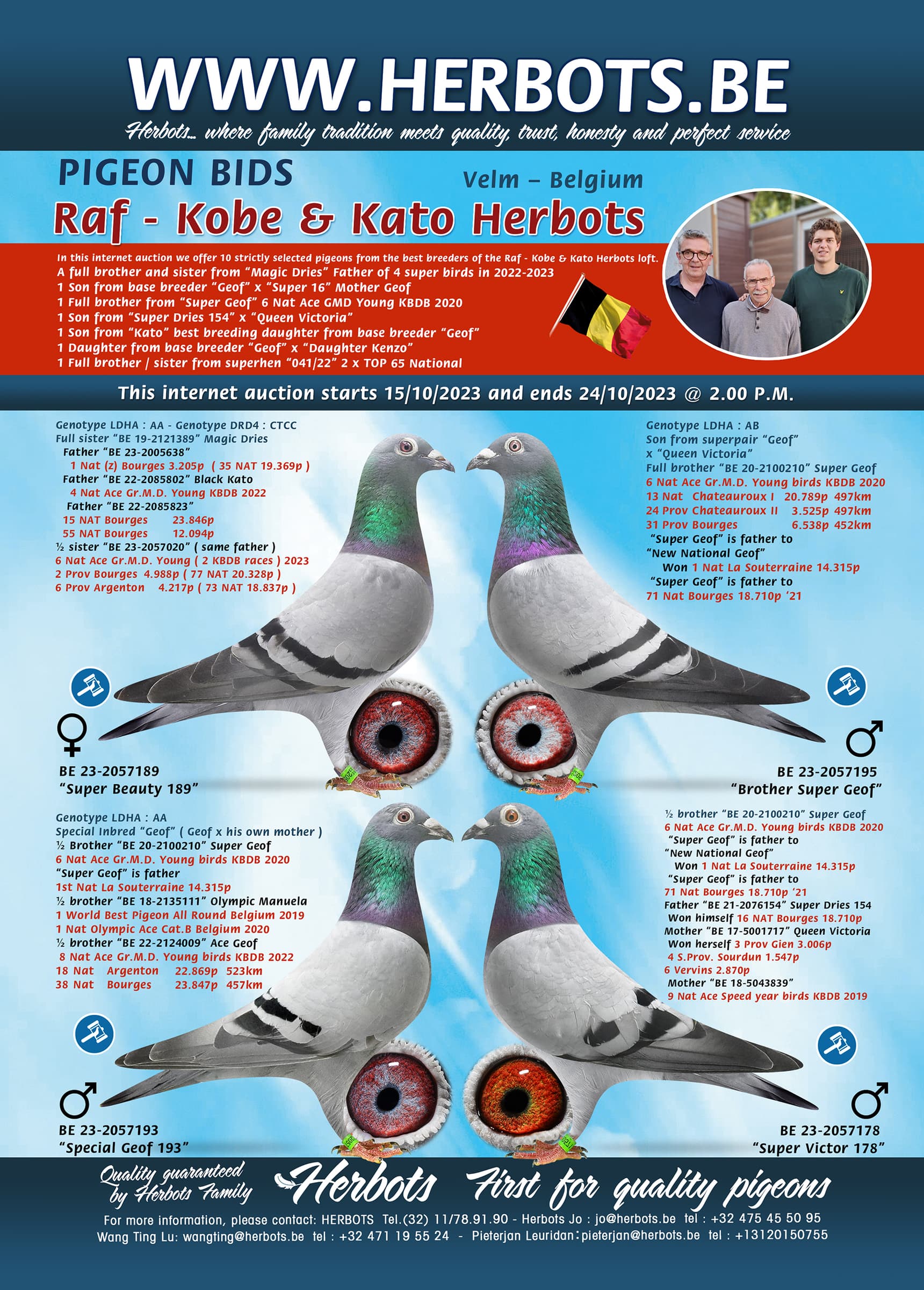 In this internet auction we offer 10 strictly selected pigeons from the best breeders of the Raf - Kobe & Kato Herbots loft.