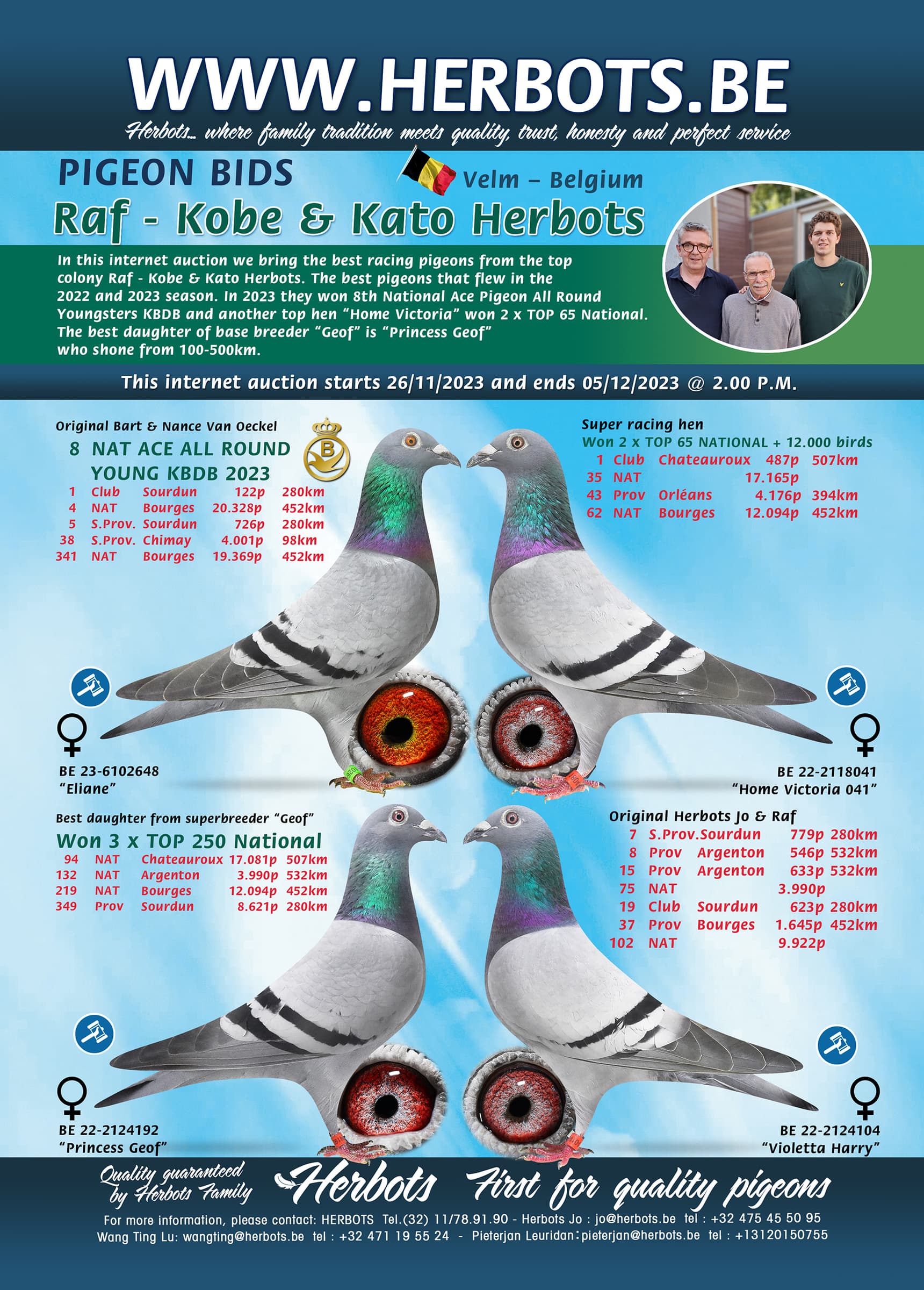 In this internet auction we bring the best racing pigeons from the top colony Raf - Kobe & Kato Herbots.
