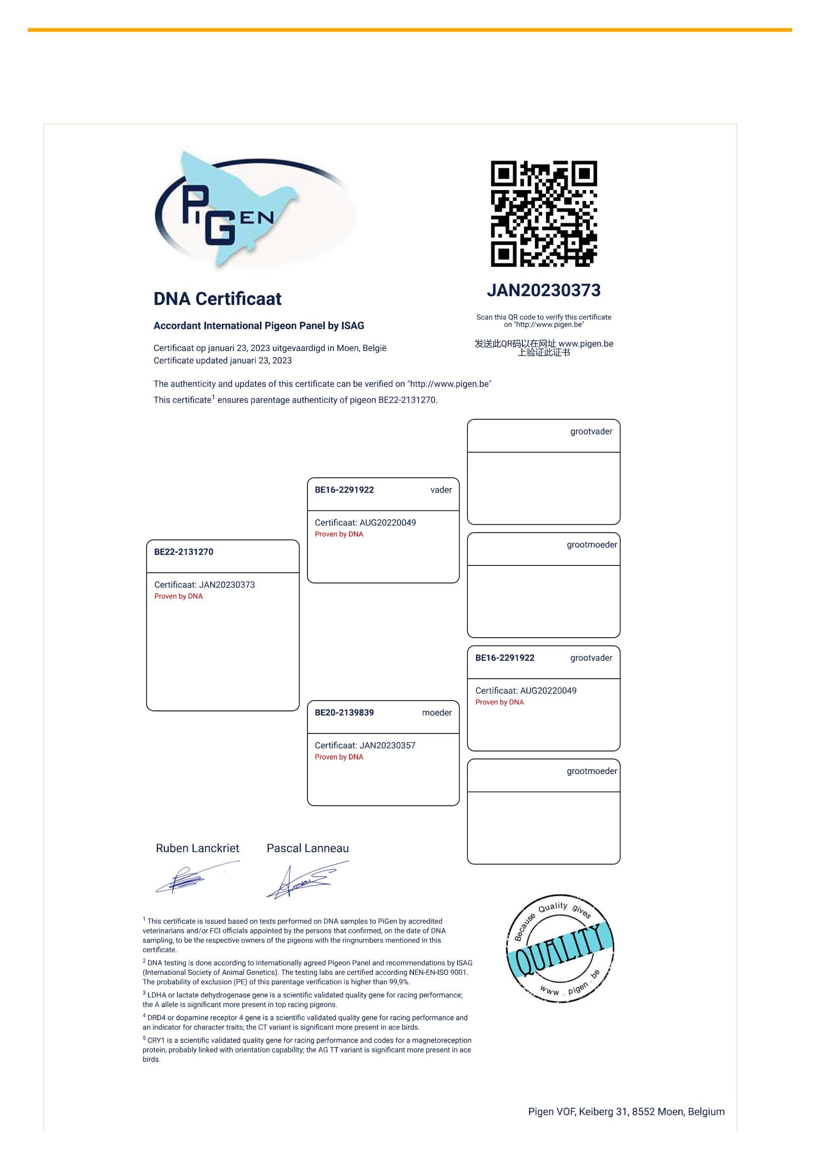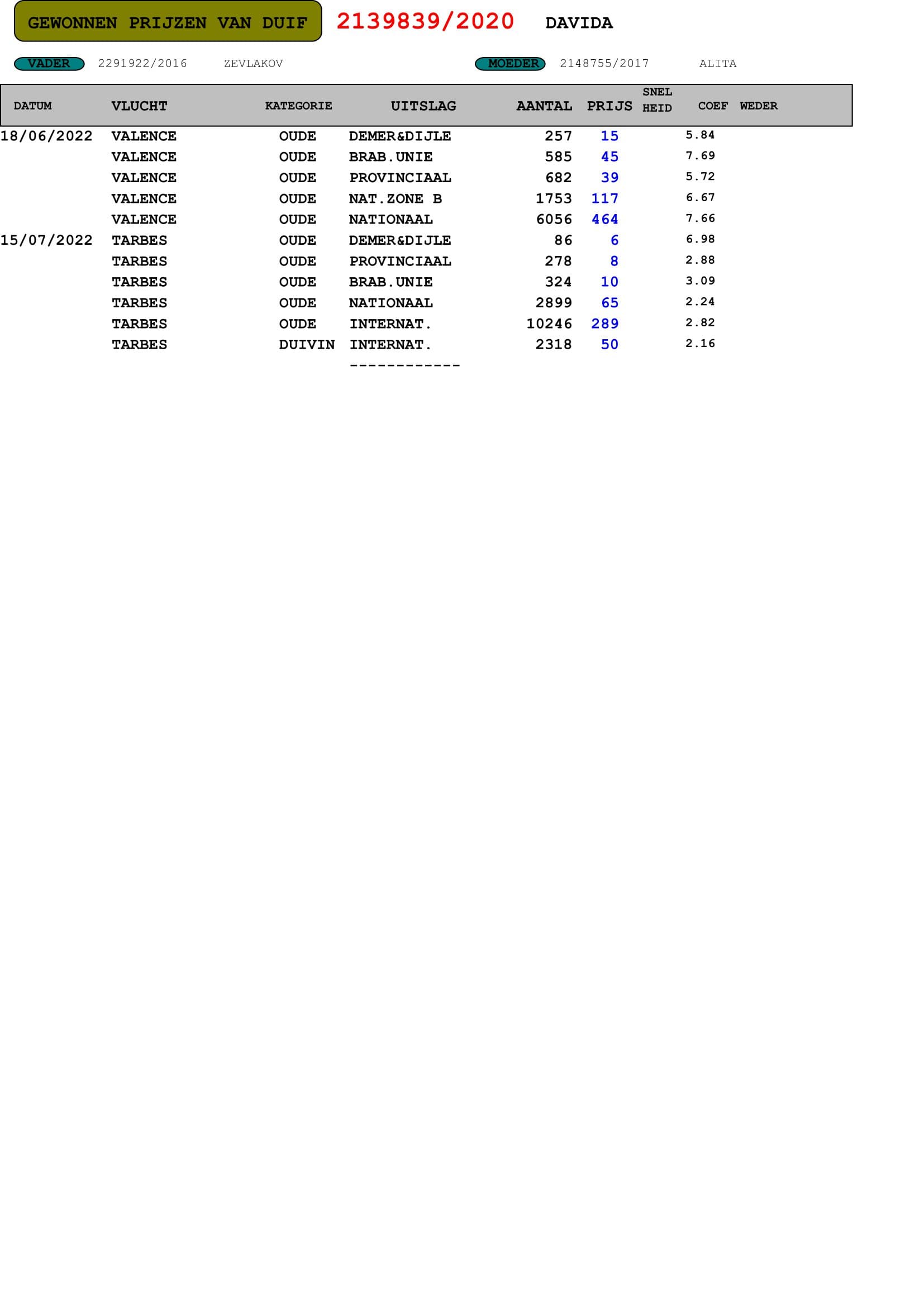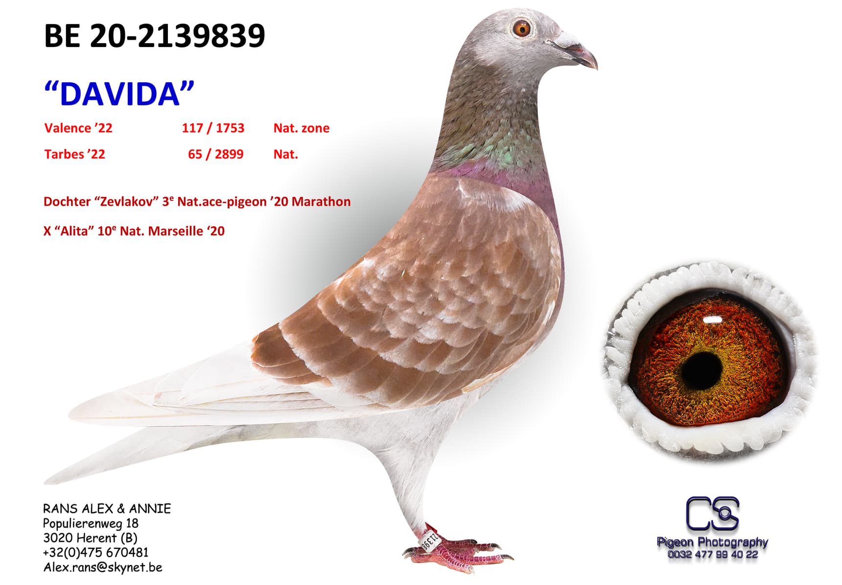Direct daughter “Zevlakov” (all info see above) x “Alita”(received as egg of Casaert Hugo. Won: 10th Nat. and 24th Internat. Marseille 10,044b. – 73rd Nat. Marseille 2,102b.. Is a granddaughter of “Invictus”(best European marathon bird 2015 at Dubois Michel.))