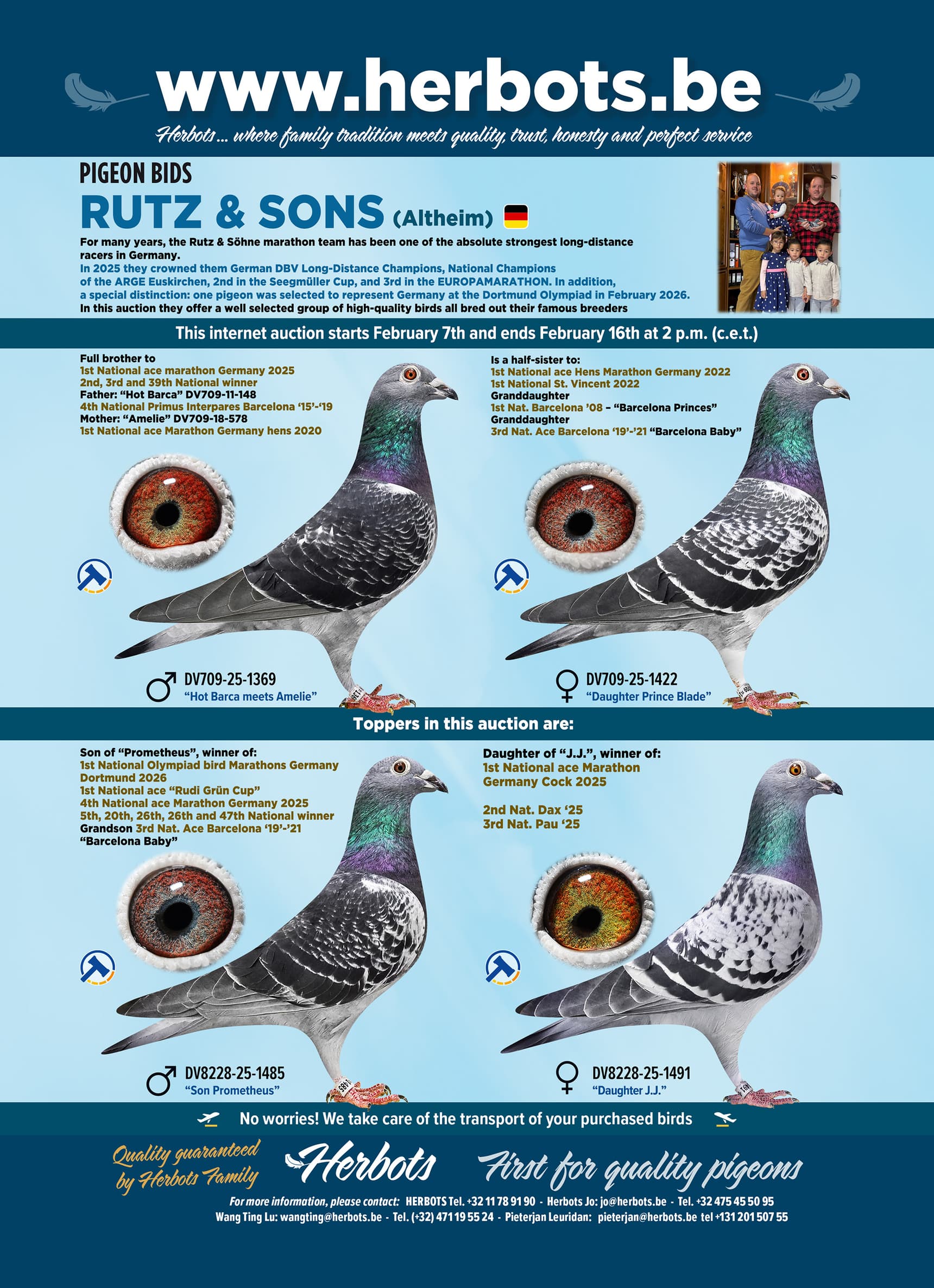 The year 2024 had already left its mark. With 87 prizes from 133 pigeons entered across seven international competitions, a remarkable success rate of 65.41%, RUTZ & Sons achieved a season at the very highest level. Among the most notable performances were a 2nd national prize from Narbonne, an impressive 28/37 from Barcelona, 10/14 from Pau, and 14/16 from Marseille. These results led them to finish the season in 4th place in the national ARGE Euskirchen Championship, 2nd in the Mediterranean Cup, and 6th in the Heinz Seegmüller Cup.