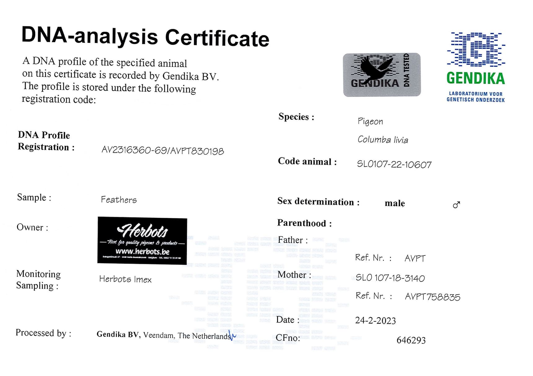 Born out “Brother Porto” (original Hok Vercammen – full brother to base breeder and 4th Nat. ace KBDB “Porto”) x “Mother Barbara S”.