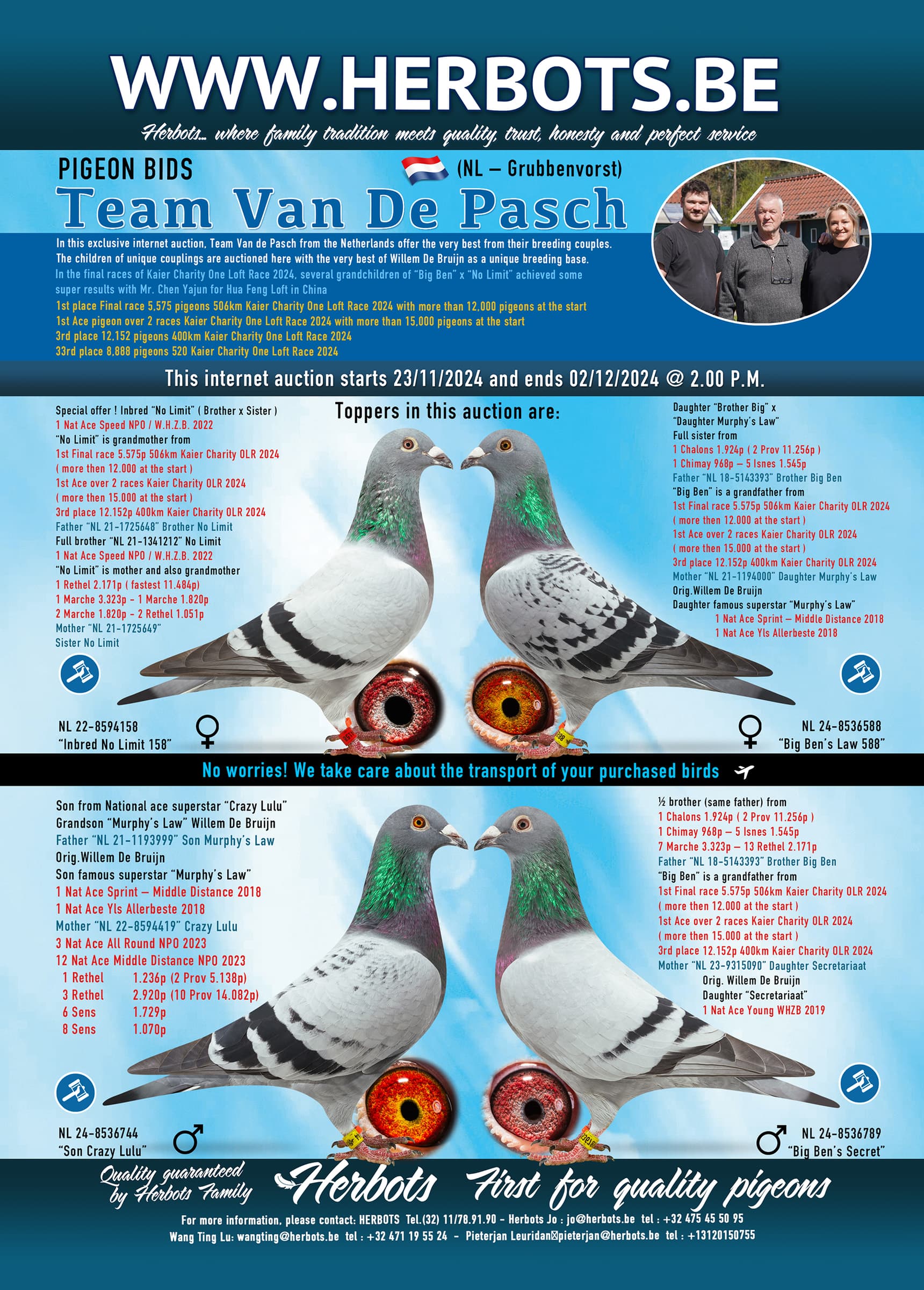 In this exclusive internet auction, Team Van de Pasch from the Netherlands offer the very best from their breeding couples. The children of unique couplings are auctioned here with the very best of Willem De Bruijn as a unique breeding base.