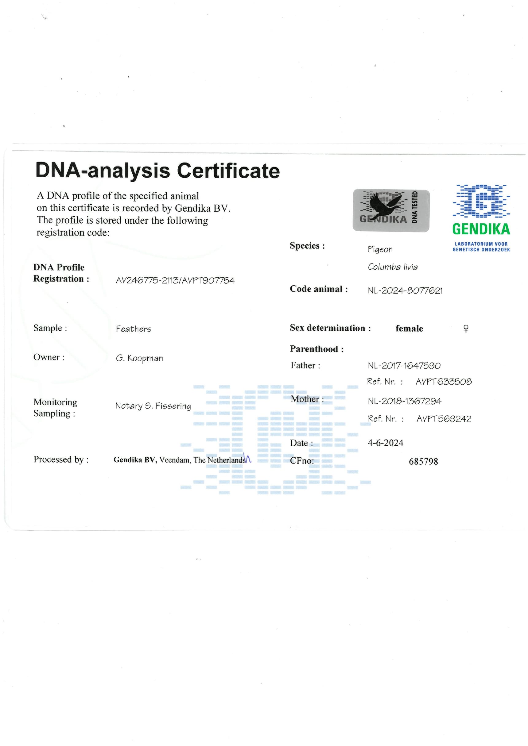 Direct daughter “Magnus” (direct son Olympiad bird “Der 269” – Roeper W.) x “Sister Tip Top 5” (full sister to 1st NPO Arras 10,735b. and to 9th Final race SAMPDR ’13)