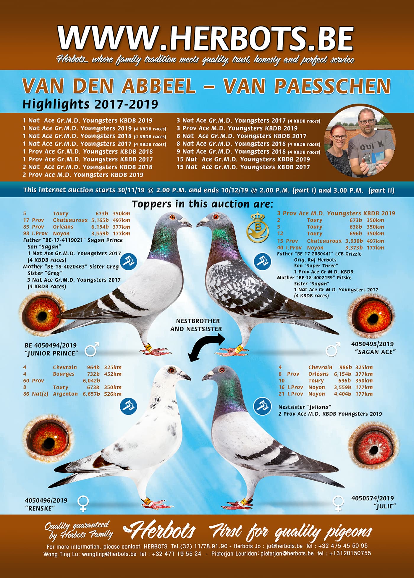 In this unique Pigeon Bids edition we offer you the young birds racing team from Van den Abbeel – Van Paesschen from Lebbeke. They managed to set a stunt that no-one else has ever done before, they win 3 years in a row the title of Best Youngster of Belgium over 4 National races and on top of this they also win the 1st National Ace bird Great Middle Distance Youngsters KBDB 2019. This is the best youngsters loft that dominated the races in 2017-2018-2019. Those who want to strengthen their loft to be able to shine with the young birds as well next year get an opportunity now they can’t let pass by.