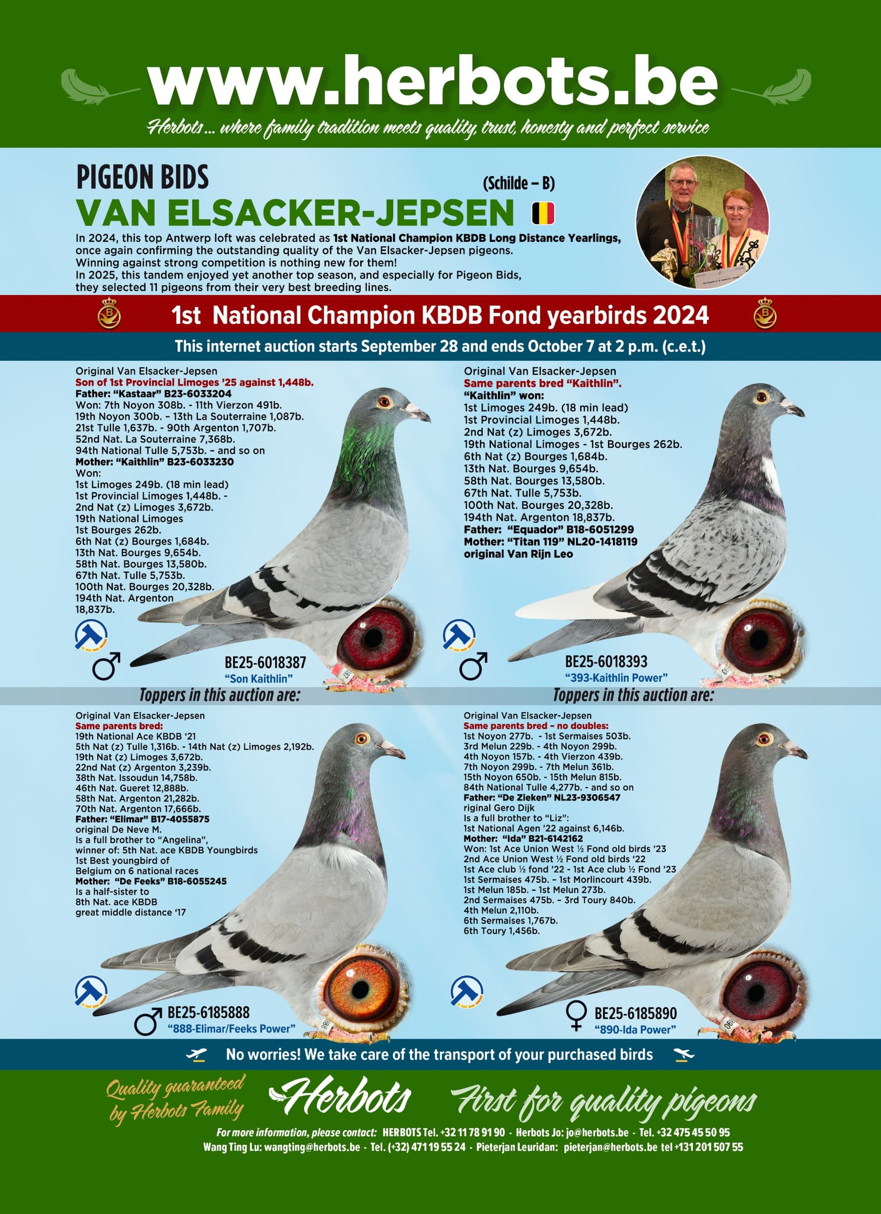 In 2024, this top Antwerp loft was celebrated as 1st National Champion KBDB Long Distance Yearlings, once again confirming the outstanding quality of the Van Elsacker-Jepsen pigeons.