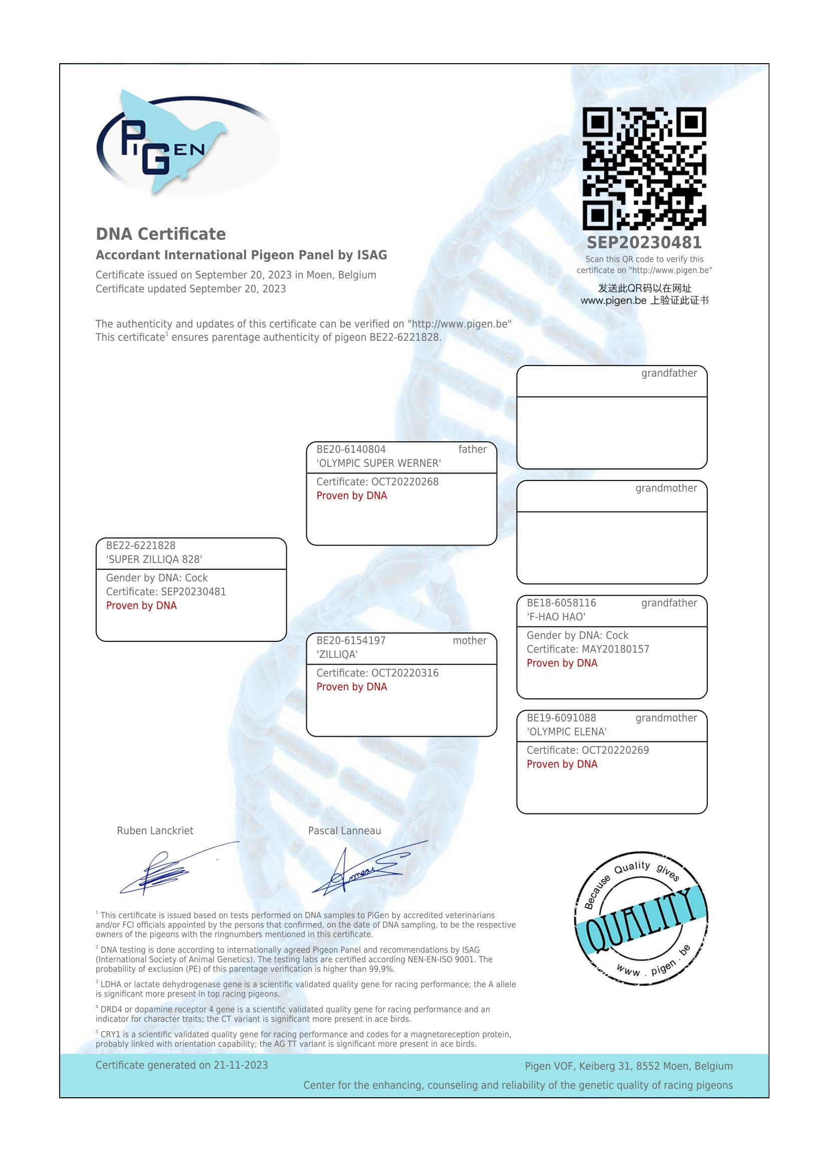 Direct daughter “F-Hao Hao” (direct son “F-16”) x Olympiad bird “Olympic Elena”