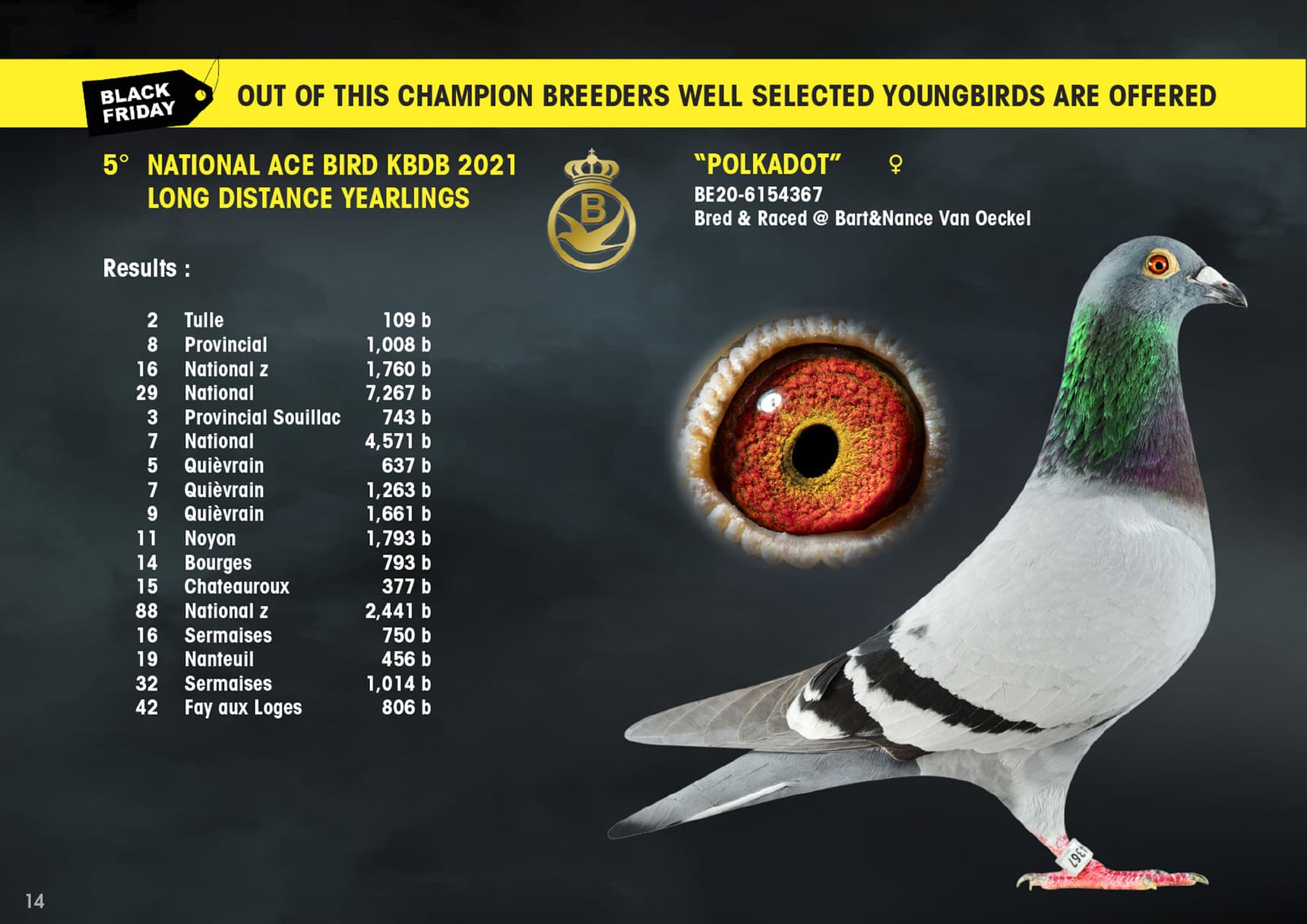 1st Nat. ace Fond WHZB ’20 – 1st National ace ½ Fond “De Allerbeste” ’20 – Olympiad bird Cat. G yearbirds ‘20 – 5th NPO Chateaudun 4,058b. - 7th NPO Fay Aux Loges 5,735b. – 11th Nat. 14,036b.
