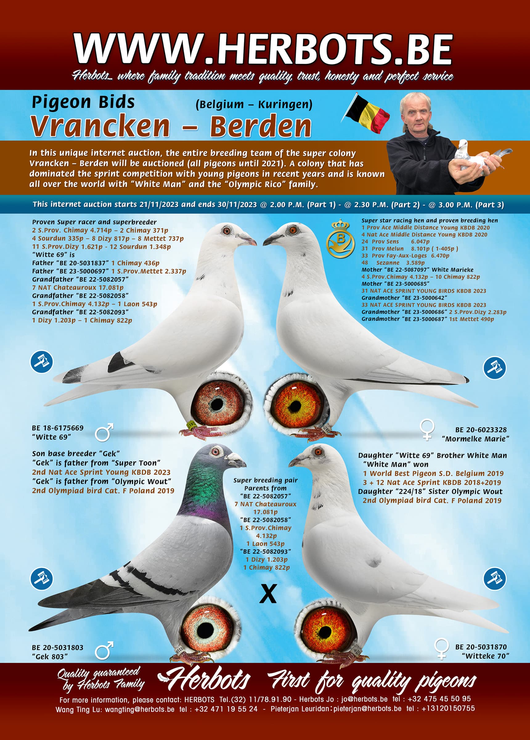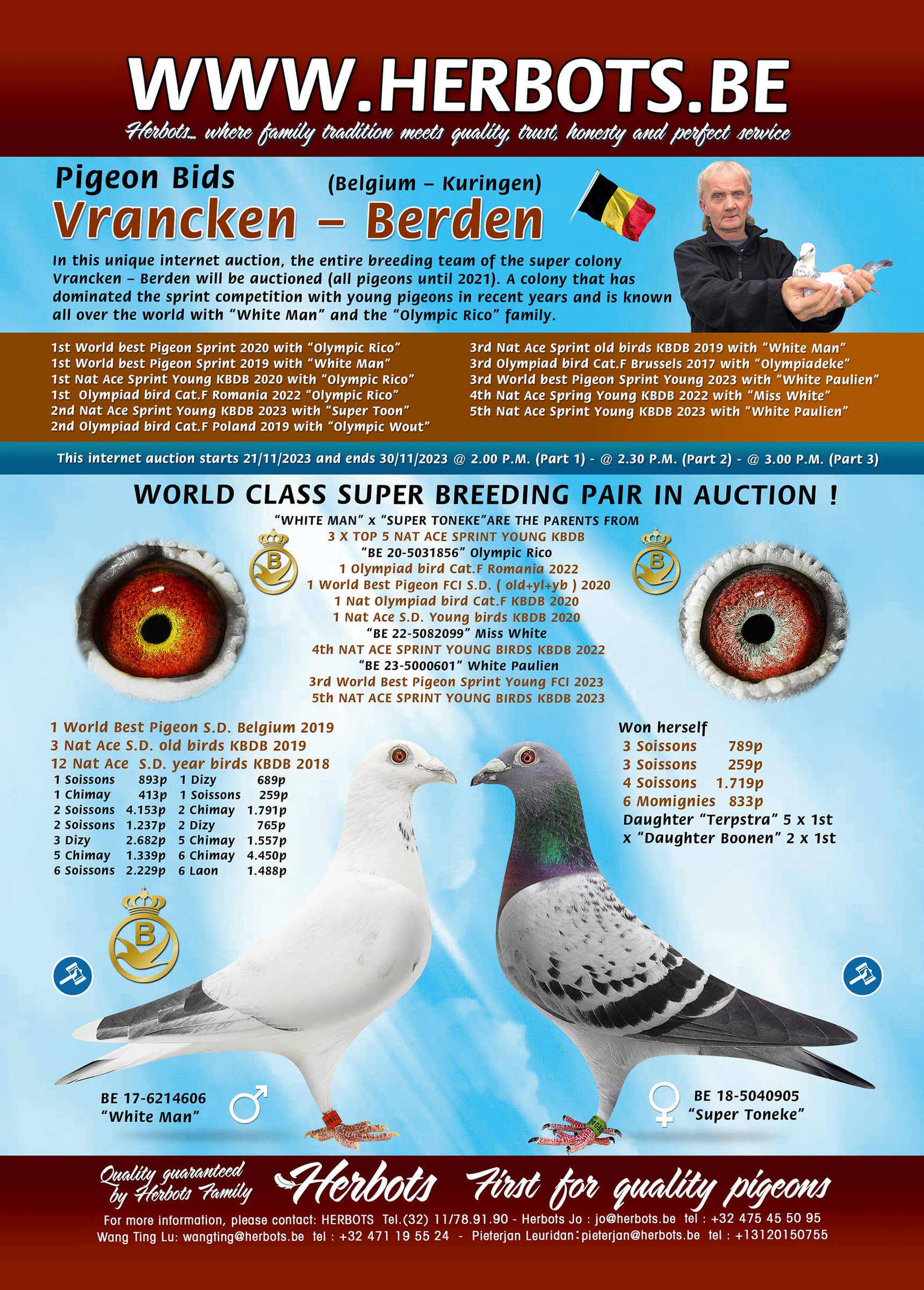 In this unique internet auction, the entire breeding team of the super colony Vrancken – Berden will be auctioned (all pigeons until 2021). A colony that has dominated the sprint competition with young pigeons in recent years and is known all over the world with “White Man” and the “Olympic Rico” family.
