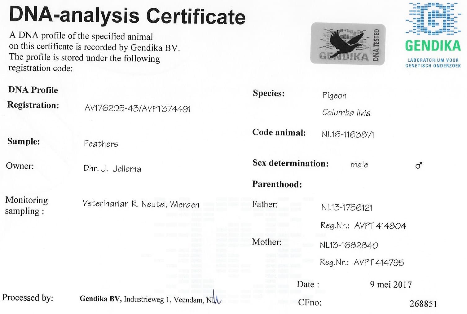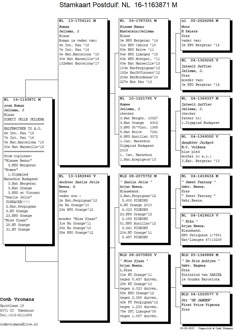 Direct daughter “Snelle Jelle” (won: 2nd Nat. Perpignan 5,600b. – 6th Orange 4,023b. – and so on) x “Miss Sjaan” (won: 31st Orange ’11- 8,457b. – 28th Orange ’10 - 4,023b. - 55th NPO Orange ’12 – 2,058b. and so on)