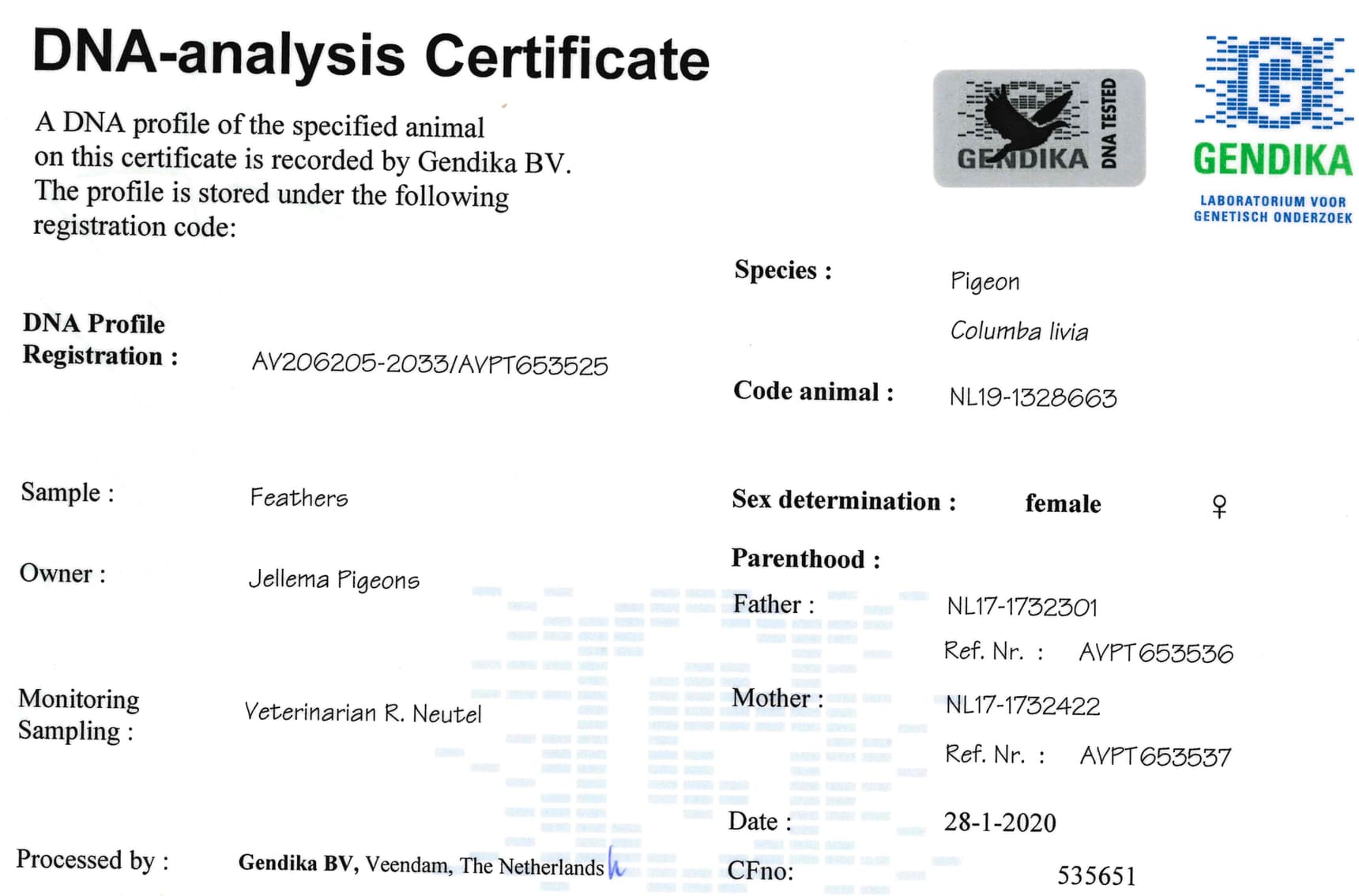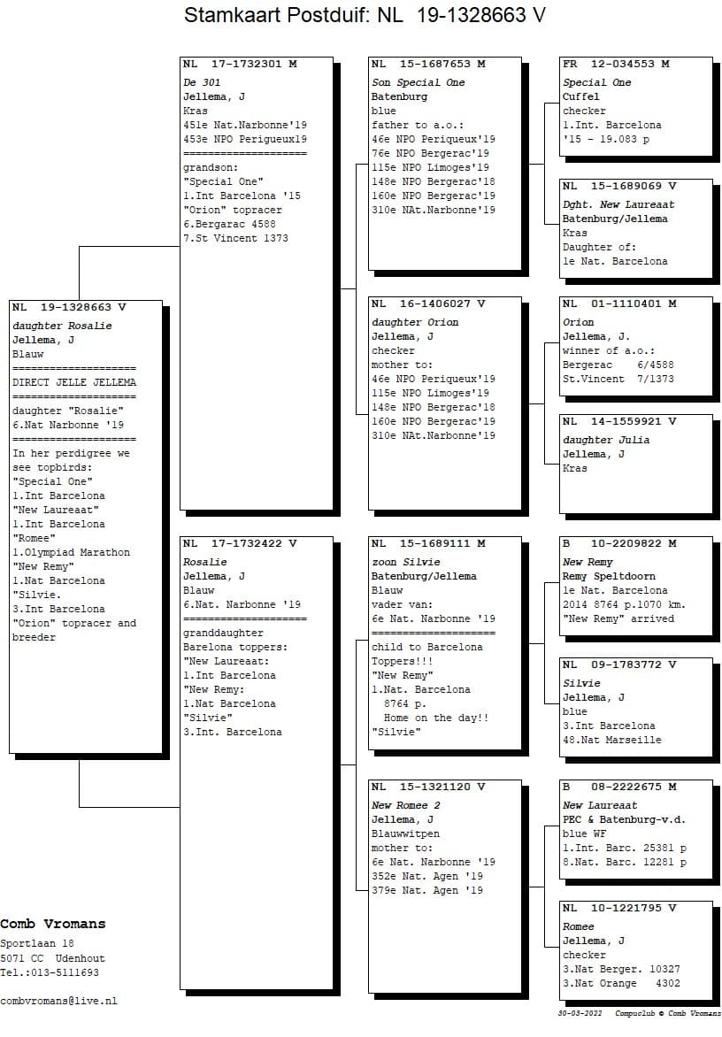Direct daughter “New Laureaat” (1st Internat. Barcelona 25,381b.) x “Romee” ( winner of: Olympiad bird marathon Budapest - 3rd Nat. Bergerac 10,327b. - 3rd Nat. Orange 4,302b. - 3rd NPO St. Vincent 1,365b. - 5th Nat. Brive 7,241b. - 6th NPO Aurillac 3,072b.)