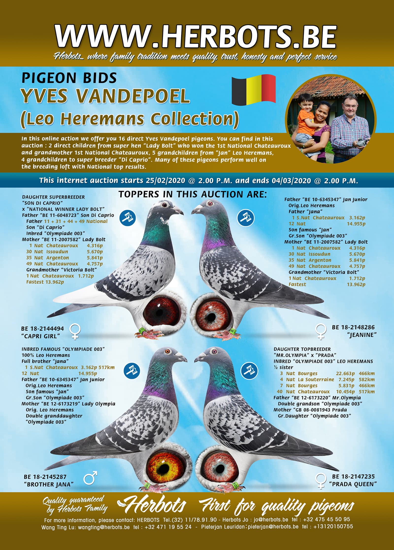 In this online action we offer you 16 direct Yves Vandepoel pigeons. You can find in this auction : 2 direct children from super hen “Lady Bolt” who won the 1st National Chateauroux and grandmother 1st National Chateauroux, 5 grandchildren from “Jan” Leo Heremans, 4 grandchildren to super breeder “Di Caprio”. Many of these pigeons perform well on the breeding loft with National top results.