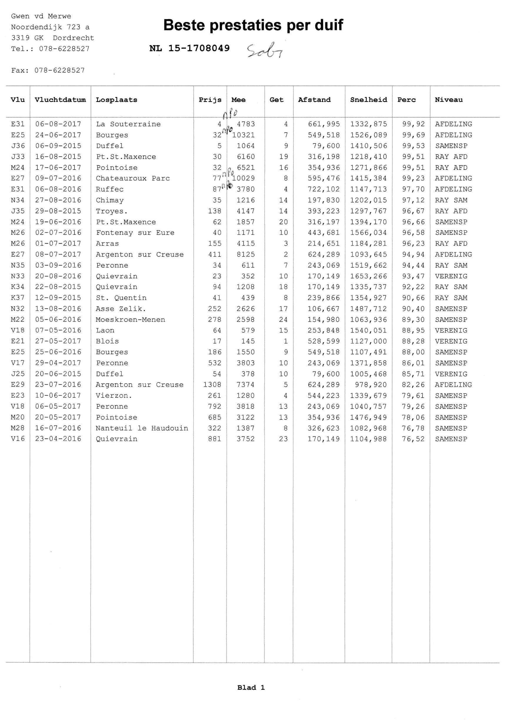 WON: 4th NPO LA SOUTERRAINE 4,783b. - 5th DUFFEL 1,064b. - 30th PONT 6,160b. - 32nd NPO BOURGES 10,321b. - 32nd PONTOISE 6,521b. - 34th PERONNE 611b. - 35th CHIMAY 1,216b. - 77th NPO CHATEAUROUX 10,029b. - 87th NPO RUFFEC 3,780b. – IS MOTHER OF 1st QUIEVRAIN (fastest of 24,000b.)